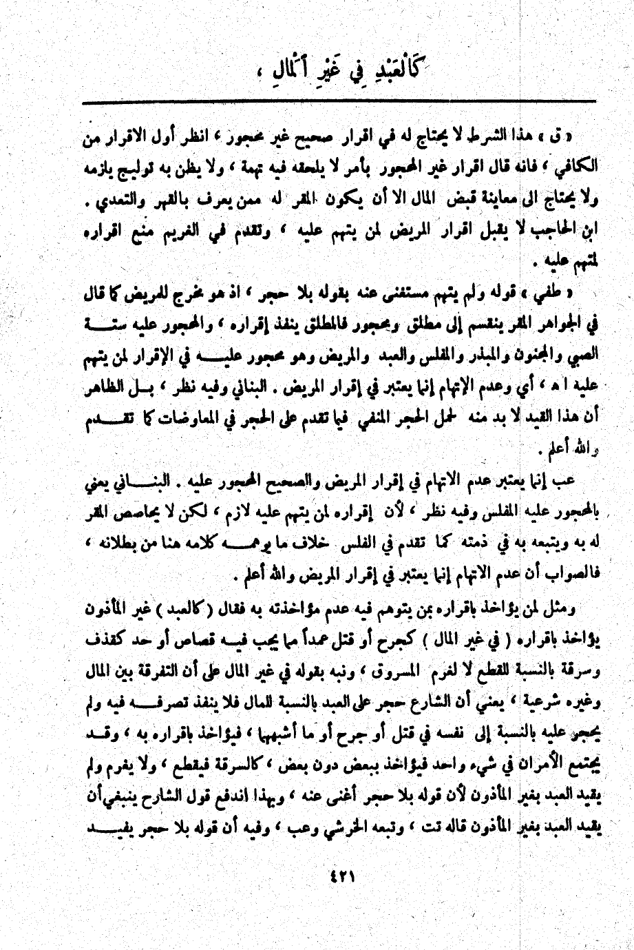 وَمَثَّلَ لِمَنْ يُؤَاخَذُ بِإِقْرَارِهِ بِمَنْ يُتَوَهَّمُ فِيهِ عَدَمُ مُؤَاخَذَتِهِ بِهِ فَقَالَ (كَالْعَبْدِ) غَيْرِ الْمَأْذُونِ يُؤَاخَذُ بِإِقْرَارِهِ (فِي غَيْرِ الْمَالِ) كَجُرْحٍ أَوْ قَتْلٍ عَمْدًا مِمَّا يَجِبُ فِيهِ قِصَاصٌ أَوْ حَدٌّ كَقَذْفٍ وَسَرِقَةٍ بِالنِّسْبَةِ لِلْقَطْعِ لَا لِغُرْمِ الْمَسْرُوقِ، وَنَبَّهَ بِقَوْلِهِ فِي غَيْرِ الْمَالِ عَلَى أَنَّ التَّفْرِقَةَ بَيْنَ الْمَالِ وَغَيْرِهِ شَرْعِيَّةٌ، يَعْنِي أَنَّ الشَّارِعَ حَجْرَ عَلَى الْعَبْدِ بِالنِّسْبَةِ لِلْمَالِ فَلَا يَنْفُذُ تَصَرُّفُهُ فِيهِ وَلَمْ يَحْجُرْ عَلَيْهِ بِالنِّسْبَةِ إلَى نَفْسِهِ فِي قَتْلٍ أَوْ جُرْحٍ أَوْ مَا أَشْبَهَهُمَا، فَيُؤَاخَذُ بِإِقْرَارِهِ بِهِ، وَقَدْ يَجْتَمِعُ الْأَمْرَانِ فِي شَيْءٍ وَاحِدٍ فَيُؤَاخَذُ بِبَعْضٍ دُونَ بَعْضٍ، كَالسَّرِقَةِ فَيُقْطَعُ، وَلَا يَغْرَمُ وَلَمْ يُقَيَّدُ الْعَبْدُ بِغَيْرِ الْمَأْذُونِ لِأَنَّ قَوْلَهُ بِلَا حَجْرٍ أَغْنَى عَنْهُ، وَبِهَذَا انْدَفَعَ قَوْلُ الشَّارِحِ يَنْبَغِي أَنْ يُقَيَّدَ الْعَبْدُ بِغَيْرِ الْمَأْذُونِ قَالَهُ تت، وَتَبِعَهُ الْخَرَشِيُّ وعب، وَفِيهِ أَنَّ قَوْلَهُ بِلَا حَجْرٍ يُفِيدُ