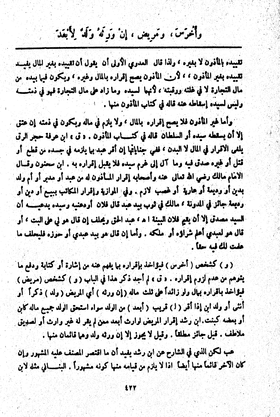 (وَ) كَشَخْصٍ (أَخْرَسَ) فَيُؤَاخَذُ بِإِقْرَارِهِ بِمَا يُفْهَمُ عَنْهُ مِنْ إشَارَةٍ أَوْ كِتَابَةٍ وَدَفْعِ مَا يُتَوَهَّمُ مِنْ عَدَمِ لُزُومِ إقْرَارِهِ. " ق " لَمْ أَجِدْ ذَكَرَ هَذَا فِي الْبَابِ (وَ) كَشَخْصٍ (مَرِيضٍ) فَيُؤَاخَذُ بِإِقْرَارِهِ بِمَالٍ وَلَوْ زَائِدًا عَلَى ثُلُثِ مَالِهِ (إنْ وَرِثَهُ) أَيْ الْمَرِيضَ (وَلَدٌ) ذَكَرًا أَوْ أُنْثَى أَوْ وَلَدُ ابْنٍ إذَا أَقَرَّ (لِ) قَرِيبٍ (أَبْعَدَ) مِنْ الْوَلَدِ سَوَاءٌ اسْتَحَقَّ الْوَلَدُ جَمِيعَ مَالِهِ كَابْنٍ أَوْ بَعْضَهُ كَبِنْتٍ. ابْنُ رُشْدٍ إقْرَارُ الْمَرِيضِ لِوَارِثٍ أَبْعَدَ مِمَّنْ لَمْ يُقِرَّ لَهُ غَيْرُ وَارِثٍ أَوْ لِصَدِيقٍ مُلَاطِفٍ. قِيلَ جَائِزٌ مُطْلَقًا. وَقِيلَ لَا يَجُوزُ إلَّا إنْ وَرِثَهُ وَلَدٌ وَهُمَا قَائِمَانِ مِنْهَا.