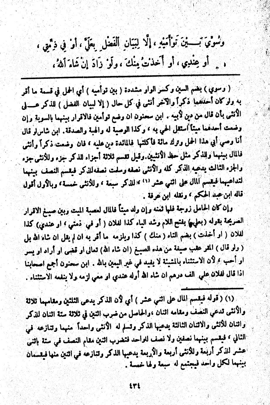 ـــــــــــــــــــــــــــــQ (وَسُوِّيَ) بِضَمِّ السِّينِ وَكَسْرِ الْوَاوِ مُشَدَّدَةً (بَيْنَ تَوْأَمَيْهِ) أَيْ الْحَمْلِ فِي قِسْمَةِ مَا أَقَرَّ بِهِ وَلَوْ كَانَ أَحَدُهُمَا ذَكَرًا وَالْآخَرُ أُنْثَى فِي كُلِّ حَالٍ (إلَّا لِبَيَانِ الْفَضْلِ) لِلذَّكَرِ عَلَى الْأُنْثَى بِأَنْ قَالَ مِنْ دَيْنٍ لِأَبِيهِ. ابْنُ سَحْنُونٍ إنْ وَضَعَتْ تَوْأَمَيْنِ فَالْإِقْرَارُ بَيْنَهُمَا بِالسَّوِيَّةِ وَإِنْ وَضَعَتْ أَحَدَهُمَا مَيِّتًا اسْتَقَلَّ الْحَيُّ بِهِ وَكَذَا الْوَصِيَّةُ لَهُ وَالْهِبَةُ وَالصَّدَقَةُ. ابْنُ شَاسٍ لَوْ قَالَ أَنَا وَصِيُّ أَبِي هَذَا الْحَمْلِ وَتَرَكَ مِائَةً فَأَكَلْتهَا فَالْمَائِدَةُ دَيْنٌ عَلَيْهِ، فَإِنْ وَضَعَتْ ذَكَرًا وَأُنْثَى فَالْمَالُ بَيْنَهُمَا وَلِلذَّكَرِ مِثْلُ حَظِّ الْأُنْثَيَيْنِ. وَقِيلَ تُقْسَمُ ثَلَاثَةَ أَجْزَاءٍ لِلذَّكَرِ جُزْءٌ وَلِلْأُنْثَى جُزْءٌ وَالْجُزْءُ الثَّالِثُ يَدَّعِيهِ الذَّكَرُ كُلُّهُ وَالْأُنْثَى نِصْفُهُ وَسَلَّمَتْ نِصْفَهُ لِلذَّكَرِ فَيُقْسَمُ النِّصْفُ بَيْنَهُمَا لِتَدَاعِيهِمَا فَيُقْسَمُ الْمَالُ عَلَى اثْنَيْ عَشَرَ، لِلذَّكَرِ سَبْعَةٌ، وَلِلْأُنْثَى خَمْسَةٌ، وَبِالْأَوَّلِ أَقُولُ قَالَهُ ابْنُ عَبْدِ الْحُكْمِ، وَنَقَلَهُ ابْنُ عَرَفَةَ.