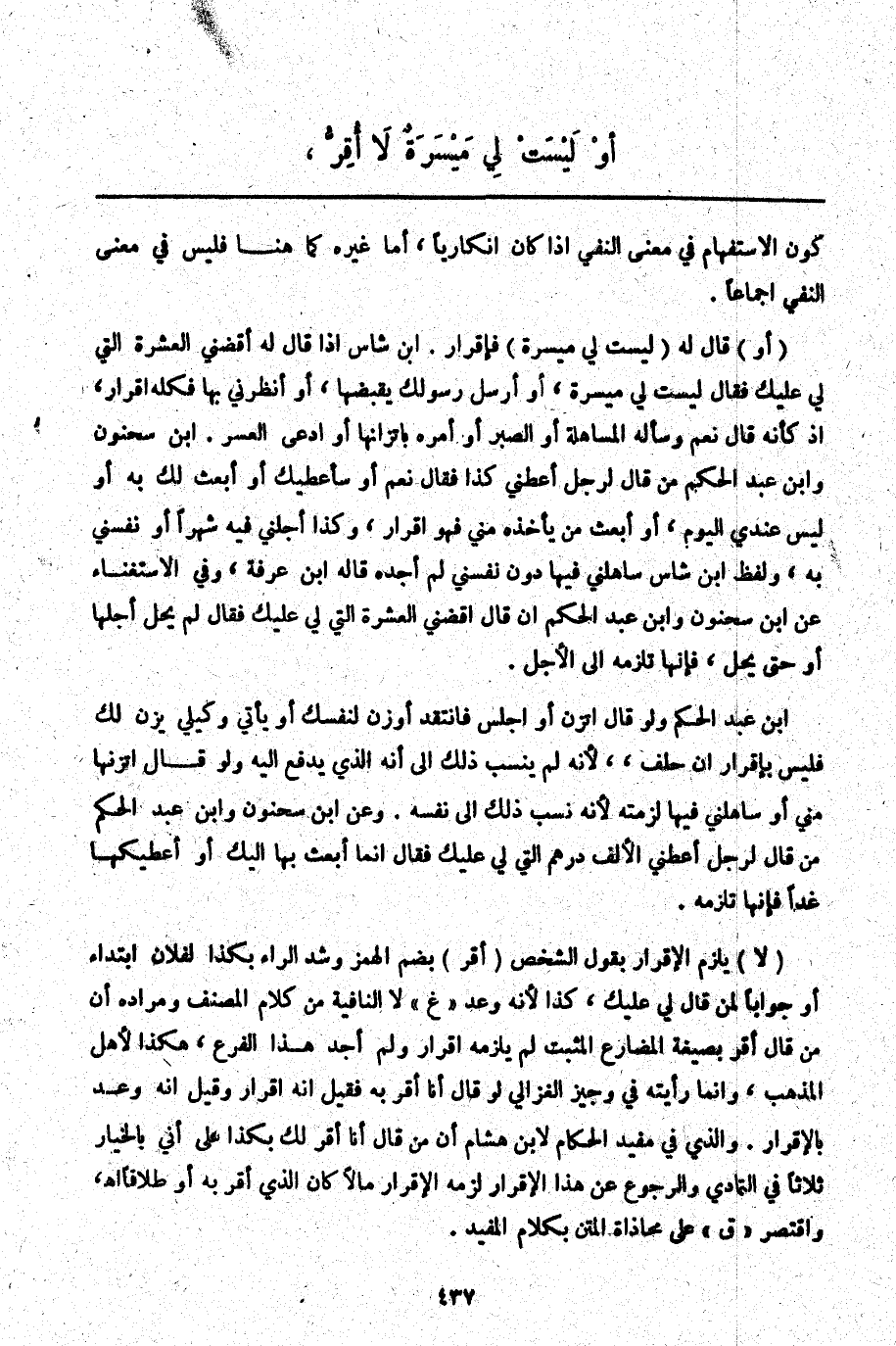 (أَوْ) قَالَ لَهُ (لَيْسَتْ لِي مَيْسَرَةٌ) فَإِقْرَارٌ. ابْنِ شَاسٍ إذَا قَالَ لَهُ اقْضِنِي الْعَشَرَةَ الَّتِي لِي عَلَيْك فَقَالَ لَيْسَتْ لِي مَيْسَرَةٌ، أَوْ أَرْسِلْ رَسُولَك يَقْبِضْهَا، أَوْ أَنْظِرْنِي بِهَا فَكُلُّهُ إقْرَارٌ، إذْ كَأَنَّهُ قَالَ نَعَمْ وَسَأَلَهُ الْمُسَاهَلَةَ أَوْ الصَّبْرَ أَوْ أَمَرَهُ بِاتِّزَانِهَا أَوْ ادَّعَى الْعُسْرَ. ابْنُ سَحْنُونٍ وَابْنُ عَبْدِ الْحَكَمِ مَنْ قَالَ لِرَجُلٍ أَعْطِنِي كَذَا فَقَالَ نَعَمْ أَوْ سَأُعْطِيك أَوْ أَبْعَثُ لَك بِهِ أَوْ لَيْسَ عِنْدِي الْيَوْمَ، أَوْ ابْعَثْ مَنْ يَأْخُذُهُ مِنِّي فَهُوَ إقْرَارٌ، وَكَذَا أَجِّلْنِي فِيهِ شَهْرًا أَوْ نَفِّسْنِي بِهِ، وَلَفْظُ ابْنِ شَاسٍ سَاهِلْنِي فِيهَا دُونَ نَفِّسْنِي لَمْ أَجِدْهُ قَالَهُ ابْنُ عَرَفَةَ، وَفِي الِاسْتِغْنَاءِ عَنْ ابْنِ سَحْنُونٍ وَابْنِ عَبْدِ الْحَكَمِ إنْ قَالَ اقْضِنِي الْعَشَرَةَ الَّتِي لِي عَلَيْك فَقَالَ لَمْ يَحِلَّ أَجَلُهَا أَوْ حَتَّى يَحِلَّ، فَإِنَّهَا تَلْزَمُهُ إلَى الْأَجَلِ.