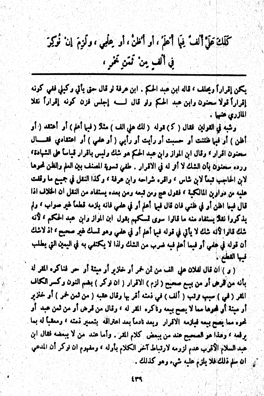 وَشَبَّهَ فِي الْقَوْلَيْنِ فَقَالَ (كَ) قَوْلِهِ (لَك عَلَيَّ أَلْف) مَثَلًا (فِيمَا أَعْلَمُ) أَوْ أَعْتَقِدُ (أَوْ أَظُنُّ) أَوْ فِيمَا ظَنَنْت أَوْ حَسِبْت أَوْ رَأَيْت أَوْ رَأْيِي (أَوْ عِلْمِي) أَوْ اعْتِقَادِي فَقَالَ سَحْنُونٌ إقْرَارٌ، وَقَالَ ابْنُ الْمَوَّازِ وَابْنُ عَبْدِ الْحَكَمِ هُوَ شَكٌّ وَلَيْسَ بِإِقْرَارٍ قِيَاسًا عَلَى الشَّهَادَةِ، وَرَدَّهُ سَحْنُونٌ بِأَنَّ الشَّكَّ لَا أَثَرَ لَهُ فِي الْإِقْرَارِ. طفي تَسْوِيَةُ الْمُصَنِّفِ بَيْنَ الْعِلْمِ وَالظَّنِّ نَحْوُهَا لِابْنِ الْحَاجِبِ تَبَعًا لِابْنِ شَاسٍ، وَأَقَرَّهُ شُرَّاحُهُ وَابْنُ عَرَفَةَ، وَكَذَا النَّقْلُ فِي جَمِيعِ مَا وَقَفْت عَلَيْهِ مِنْ دَوَاوِينِ الْمَالِكِيَّةِ، فَقَوْلُ عج وَمَنْ تَبِعَهُ وَمَنْ بَعْدَهُ يُسْتَفَادُ مِنْ النَّقْلِ أَنَّ الْخِلَافَ إذَا قَالَ فِيمَا أَظُنُّ أَوْ فِي ظَنِّي فَإِنْ قَالَ فِيمَا أَعْلَمُ أَوْ فِي عِلْمِي فَإِنَّهُ يَلْزَمُهُ قَطْعًا غَيْرُ صَوَابٍ، وَلَمْ يَذْكُرُوا نَقْلًا يُسْتَفَادُ مِنْهُ مَا قَالُوا سِوَى تَمَسُّكِهِمْ بِقَوْلِ ابْنِ الْمَوَّازِ وَابْنِ عَبْدِ الْحَكَمِ لِأَنَّهُ شَكٌّ قَالُوا لِأَنَّهُ شَكٌّ لَا يَأْتِي فِي قَوْلِهِ فِيمَا أَعْلَمُ أَوْ فِي عِلْمِي وَهُوَ تَمَسُّكٌ غَيْرُ صَحِيحٍ، إذْ لَا شَكَّ أَنَّ قَوْلَهُ فِي عِلْمِي أَوْ فِيمَا أَعْلَمُ فِيهِ ضَرْبٌ مِنْ الشَّكِّ وَلِذَا لَا يُكْتَفَى بِهِ فِي الْيَمِينِ الَّتِي يُطْلَبُ فِيهَا الْقَطْعُ.