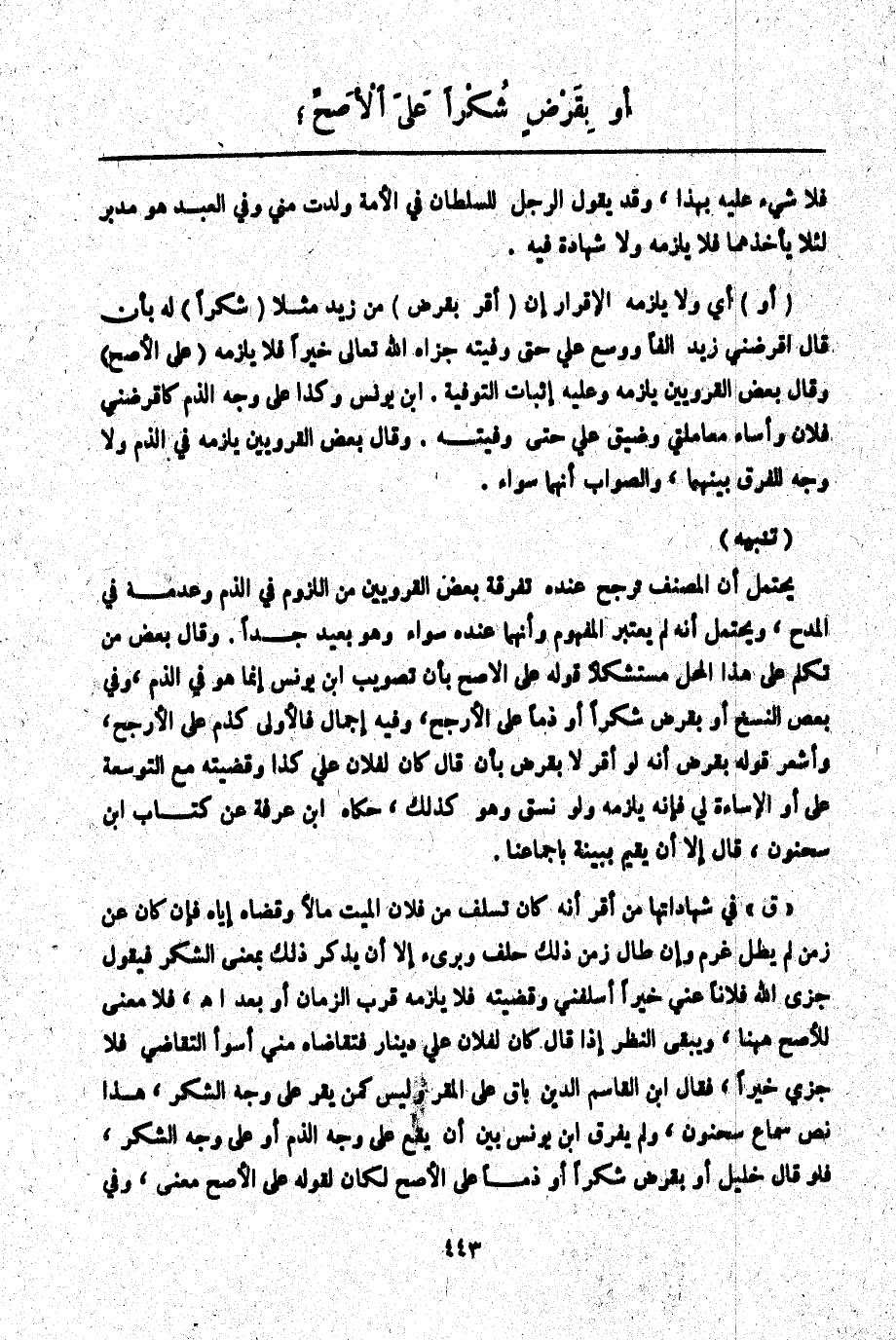 " ق " فِي شَهَادَاتِهَا مَنْ أَقَرَّ أَنَّهُ كَانَ تَسَلَّفَ مِنْ فُلَانٍ الْمَيِّتِ مَالًا وَقَضَاهُ إيَّاهُ فَإِنْ كَانَ عَنْ زَمَنٍ لَمْ يَطُلْ غَرِمَ وَإِنْ طَالَ زَمَنُ ذَلِكَ حَلَفَ وَبَرِئَ إلَّا أَنْ يَذْكُرَ ذَلِكَ بِمَعْنَى الشُّكْرِ فَيَقُولَ جَزَى اللَّهُ فُلَانًا عَنِّي خَيْرًا أَسْلَفَنِي وَقَضَيْتُهُ فَلَا يَلْزَمُهُ قُرْبُ الزَّمَانِ أَوْ بُعْدٌ. اهـ. فَلَا مَعْنَى لِلْأَصَحِّ هَاهُنَا، وَيَبْقَى النَّظَرُ إذَا قَالَ كَانَ لِفُلَانٍ عَلَيَّ دِينَارٌ فَتَقَاضَاهُ مِنِّي أَسْوَأَ التَّقَاضِي فَلَا جُزِيَ خَيْرٌ، فَقَالَ ابْنُ الْقَاسِمِ الدَّيْنُ بَاقٍ عَلَى الْمُقِرِّ وَلَيْسَ كَمَنْ يُقِرُّ عَلَى وَجْهِ الشُّكْرِ، هَذَا نَصُّ سَمَاعِ سَحْنُونٍ، وَلَمْ يُفَرِّقْ ابْنُ يُونُسَ بَيْنَ أَنْ يَقَعَ عَلَى وَجْهِ الذَّمِّ أَوْ عَلَى وَجْهِ الشُّكْرِ، فَلَوْ قَالَ خَلِيلٌ أَوْ بِقَرْضٍ شُكْرًا أَوْ ذَمًّا عَلَى الْأَصَحِّ لَكَانَ لِقَوْلِهِ عَلَى الْأَصَحِّ مَعْنًى، وَفِي