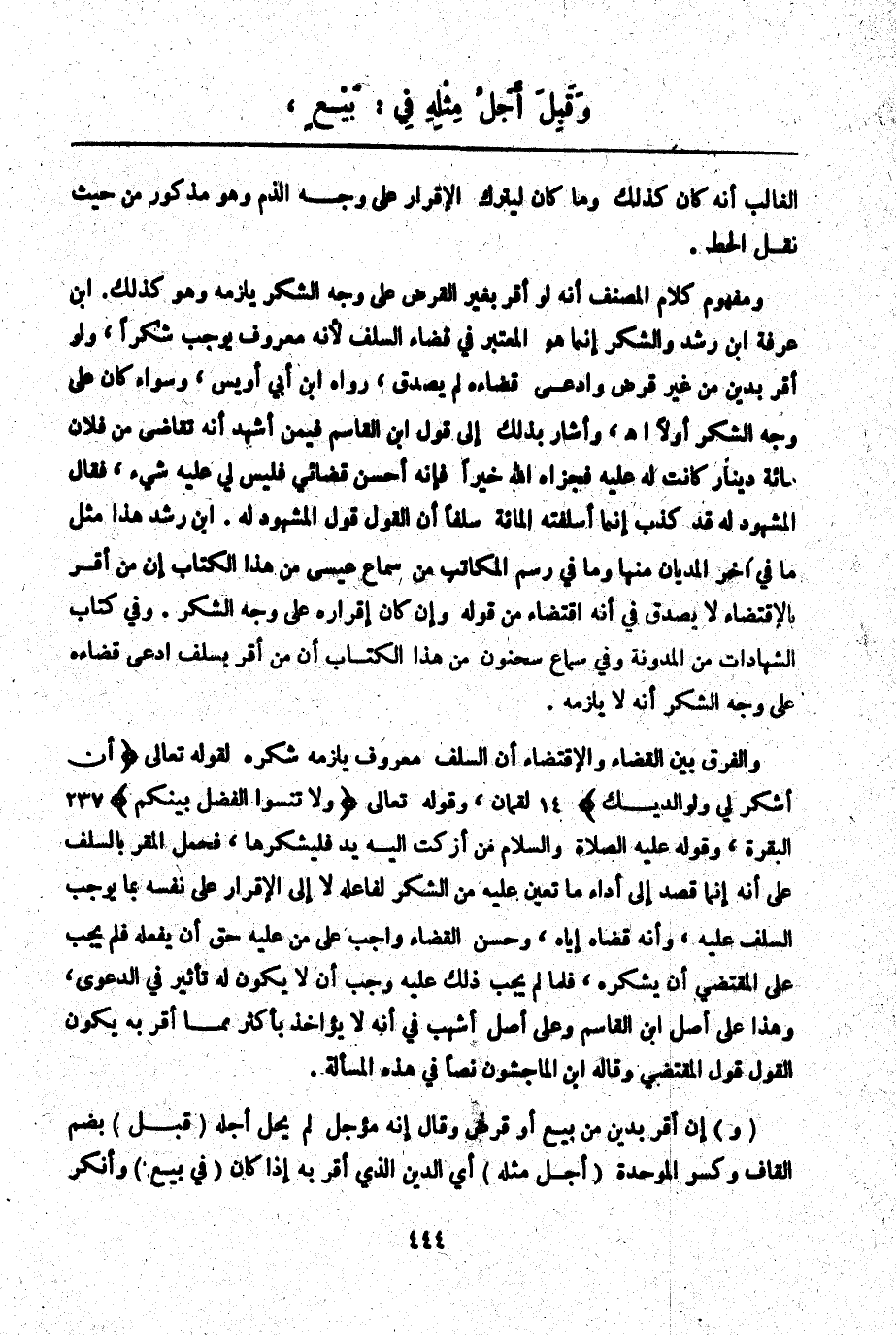 وَمَفْهُومُ كَلَامِ الْمُصَنِّفِ أَنَّهُ لَوْ أَقَرَّ بِغَيْرِ الْقَرْضِ عَلَى وَجْهِ الشُّكْرِ يَلْزَمُهُ وَهُوَ كَذَلِكَ. ابْنُ عَرَفَةَ ابْنُ رُشْدٍ وَالشُّكْرُ إنَّمَا هُوَ الْمُعْتَبَرُ فِي قَضَاءِ السَّلَفِ لِأَنَّهُ مَعْرُوفٌ يُوجِبُ شُكْرًا، وَلَوْ أَقَرَّ بِدَيْنٍ مِنْ غَيْرِ قَرْضٍ وَادَّعَى قَضَاءَهُ لَمْ يُصَدَّقْ، رَوَاهُ ابْنُ أَبِي أُوَيْسٍ، وَسَوَاءٌ كَانَ عَلَى وَجْهِ الشُّكْرِ أَوْ لَا. اهـ. وَأَشَارَ بِذَلِكَ إلَى قَوْلِ ابْنِ الْقَاسِمِ فِيمَنْ أَشْهَدَ أَنَّهُ تَقَاضَى مِنْ فُلَانٍ مِائَةَ دِينَارٍ كَانَتْ لَهُ عَلَيْهِ فَجَزَاهُ اللَّهُ خَيْرًا فَإِنَّهُ أَحْسَنَ قَضَائِي فَلَيْسَ لِي عَلَيْهِ شَيْءٌ، فَقَالَ الْمَشْهُودُ لَهُ قَدْ كَذَبَ إنَّمَا أَسْلَفْته الْمِائَةَ سَلَفًا إنَّ الْقَوْلَ قَوْلُ الْمَشْهُودِ لَهُ. ابْنُ رُشْدٍ هَذَا مِثْلُ مَا فِي آخِرِ الْمِدْيَانِ مِنْهَا وَمَا فِي رَسْمِ الْمُكَاتَبِ مِنْ سَمَاعِ عِيسَى مِنْ هَذَا الْكِتَابِ إنَّ مَنْ أَقَرَّ بِالِاقْتِضَاءِ لَا يُصَدَّقُ فِي أَنَّهُ اقْتِضَاءٌ مِنْ قَوْلِهِ وَإِنْ كَانَ إقْرَارُهُ عَلَى وَجْهِ الشُّكْرِ. وَفِي كِتَابِ الشَّهَادَاتِ مِنْ الْمُدَوَّنَةِ وَفِي سَمَاعِ سَحْنُونٍ مِنْ هَذَا الْكِتَابِ أَنَّ مَنْ أَقَرَّ بِسَلَفٍ ادَّعَى قَضَاءَهُ عَلَى وَجْهِ الشُّكْرِ أَنَّهُ لَا يَلْزَمُهُ.