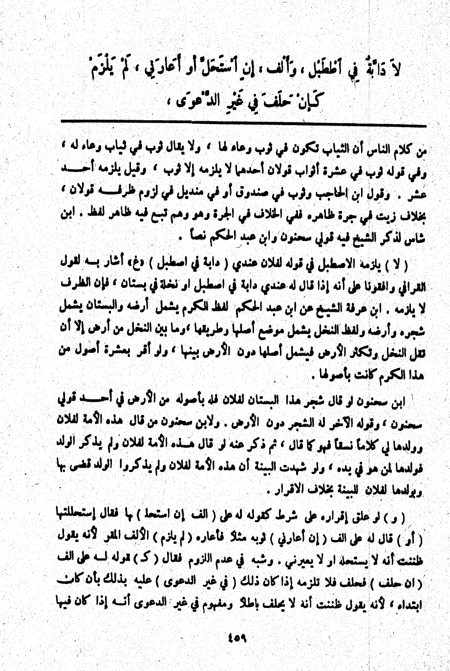 (لَا) يَلْزَمُهُ الْإِصْطَبْلُ فِي قَوْلِهِ لِفُلَانٍ عِنْدِي (دَابَّةٌ فِي إصْطَبْلٍ) " غ " أَشَارَ بِهِ لِقَوْلِ الْقَرَافِيِّ وَافَقُونَا عَلَى أَنَّهُ إذَا قَالَ لَهُ عِنْدِي دَابَّةٌ فِي إصْطَبْلٍ أَوْ نَخْلَةٌ فِي بُسْتَانٍ، فَإِنَّ الظَّرْفَ لَا يَلْزَمُهُ. ابْنُ عَرَفَةَ الشَّيْخُ عَنْ ابْنِ عَبْدِ الْحَكَمِ لَفْظُ الْكَرْمِ يَشْمَلُ. أَرْضَهُ وَالْبُسْتَانُ يَشْمَلُ شَجَرَهُ وَأَرْضَهُ وَلَفْظُ النَّخْلِ يَشْمَلُ مَوْضِعَ أَصْلِهَا وَطَرِيقِهَا، وَمَا بَيْنَ النَّخْلِ مِنْ أَرْضٍ إلَّا أَنْ تَقِلَّ النَّخْلُ وَتَكْثُرَ الْأَرْضُ فَيَشْمَلَ أَصْلَهَا دُونَ الْأَرْضِ بَيْنَهَا، وَلَوْ أَقَرَّ بِعَشَرَةِ أُصُولٍ مِنْ هَذَا الْكَرْمِ كَانَتْ بِأُصُولِهَا.