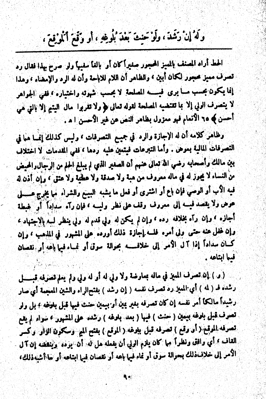 (وَ) إنْ تَصَرَّفَ الْمُمَيِّزُ فِي مَالِهِ بِمُعَاوَضَةٍ وَلَا وَلِيَّ لَهُ أَوْ لَهُ وَلِيٌّ وَلَمْ يَعْلَمْ تَصَرُّفَهُ قَبْلَ رُشْدِهِ فَ (لَهُ) أَيْ الْمُمَيِّزِ رَدُّ تَصَرُّفِ نَفْسِهِ (إنْ رَشَدَ) بِفَتْحِ الرَّاءِ وَالشِّينِ الْمُعْجَمَةِ أَيْ صَارَ رَشِيدًا مَالِكًا أَمْرَ نَفْسِهِ إنْ كَانَ تَصَرُّفُهُ بِغَيْرِ يَمِينٍ أَوْ بِيَمِينٍ حَنِثَ فِيهَا قَبْلَ بُلُوغِهِ، بَلْ وَلَوْ تَصَرَّفَ قَبْلَ بُلُوغِهِ بِيَمِينٍ (حَنِثَ) فِيهَا (بَعْدَ بُلُوغِهِ) رُشْدَهُ عَلَى الْمَشْهُورِ، سَوَاءٌ لَمْ يَقَعْ تَصَرُّفُهُ الْمَوْقِعَ (أَوْ وَقَعَ) تَصَرُّفُهُ قَبْلَ بُلُوغِهِ (الْمَوْقِعَ) بِفَتْحِ الْمِيمِ وَسُكُونِ الْوَاوِ وَكَسْرِ الْقَافِ، أَيْ وَافَقَ وَنَظَرًا مِمَّا كَانَ يَلْزَمُ الْوَلِيَّ أَنْ يَفْعَلَهُ هَلْ لَهُ أَنْ يَرُدَّهُ وَيَنْقُضَهُ إنْ آلَ الْأَمْرُ إلَى خِلَافِ ذَلِكَ بِحَوَالَةِ سُوقٍ أَوْ نَمَاءٍ فِيمَا بَاعَهُ أَوْ نُقْصَانٍ فِيمَا ابْتَاعَهُ أَوْ مَا أَشْبَهَ ذَلِكَ،