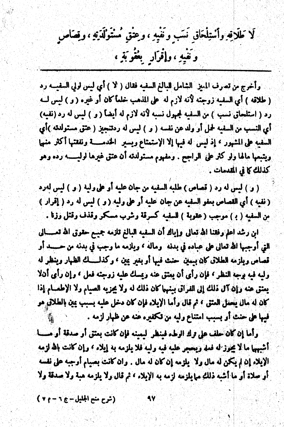 (وَ) لَيْسَ لَهُ رَدُّ (قِصَاصٍ) طَلَبَهُ السَّفِيهُ مِنْ جَانٍ عَلَيْهِ أَوْ عَلَى وَلِيِّهِ (وَ) لَيْسَ لَهُ رَدُّ (نَفْيِهِ) أَيْ الْقِصَاصِ بِعَفْوِ السَّفِيهِ عَنْ جَانٍ عَلَيْهِ أَوْ عَلَى وَلِيِّهِ (وَ) لَيْسَ لَهُ رَدُّ (إقْرَارٍ) مِنْ السَّفِيهِ (بِ) مُوجَبِ (عُقُوبَةٍ) لِلسَّفِيهِ كَسَرِقَةٍ وَشُرْبِ مُسْكِرٍ وَقَذْفٍ وَقَتْلٍ وَزِنًا. ابْنُ رُشْدٍ: اعْلَمْ وَفَّقَنَا اللَّهُ تَعَالَى وَإِيَّاكَ أَنَّ السَّفِيهَ الْبَالِغَ تَلْزَمُهُ جَمِيعُ حُقُوقِ اللَّهِ تَعَالَى الَّتِي أَوْجَبَهَا اللَّهُ تَعَالَى عَلَى عِبَادِهِ فِي بَدَنِهِ وَمَالِهِ، وَيَلْزَمُهُ مَا وَجَبَ فِي بَدَنِهِ مِنْ حَدٍّ أَوْ قِصَاصٍ وَيَلْزَمُهُ الطَّلَاقُ كَانَ بِيَمِينٍ حَنِثَ فِيهَا أَوْ بِغَيْرِ يَمِينٍ، وَكَذَلِكَ الظِّهَارُ، وَيَنْظُرُ لَهُ وَلِيُّهُ فِيهِ بِوَجْهِ النَّظَرِ، فَإِنْ رَأَى أَنْ يُعْتِقَ عَنْهُ وَيُمْسِكَ عَلَيْهِ زَوْجَتَهُ فَعَلَ، وَإِنْ رَأَى أَنْ لَا يُعْتِقَ عَنْهُ وَإِنْ آلَ ذَلِكَ إلَى الْفِرَاقِ بَيْنَهُمَا كَانَ ذَلِكَ لَهُ وَلَا يَجْزِيهِ الصِّيَامُ وَلَا الْإِطْعَامُ إذَا كَانَ لَهُ مَالٌ يَحْمِلُ الْعِتْقَ، ثُمَّ قَالَ وَأَمَّا الْإِيلَاءُ فَإِنْ كَانَ دَخَلَ عَلَيْهِ بِسَبَبِ يَمِينٍ بِالطَّلَاقِ وَهُوَ فِيهَا عَلَى حِنْثٍ أَوْ بِسَبَبِ امْتِنَاعِ وَلِيِّهِ مِنْ تَكْفِيرِهِ عَنْهُ عَنْ ظِهَارٍ لَزِمَهُ.