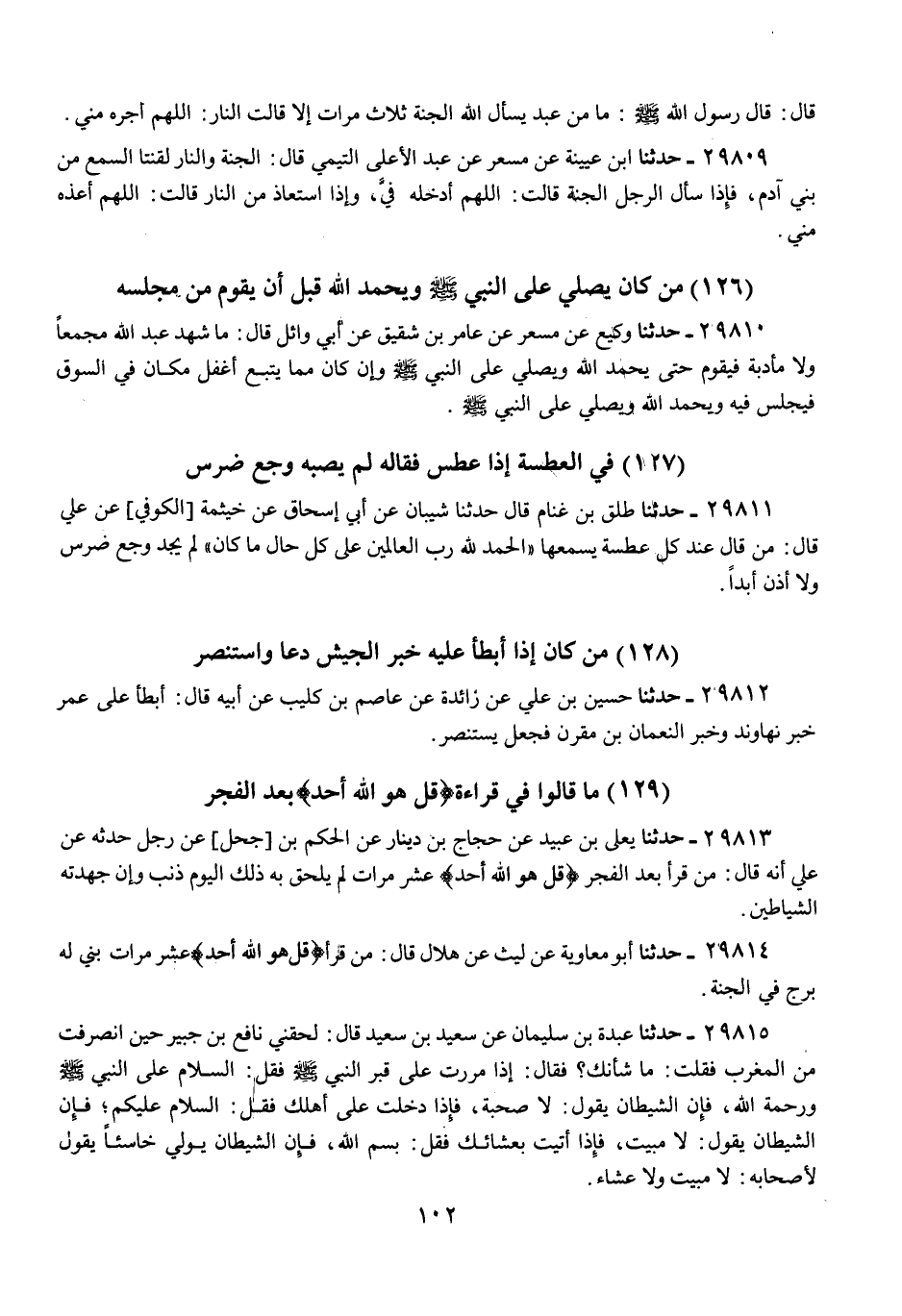 29810 - حَدَّثَنَا وَكِيعٌ، عَنْ مِسْعَرٍ، عَنْ عَامِرِ بْنِ شَقِيقٍ، عَنْ أَبِي وَائِلٍ، قَالَ: «§مَا شَهِدَ عَبْدُ اللَّهِ مَجْمَعًا، وَلَا مَأْدُبَةً فَيَقُومُ حَتَّى يَحْمَدَ اللَّهَ، وَيُصَلِّيَ عَلَى النَّبِيِّ صَلَّى اللهُ عَلَيْهِ وَسَلَّمَ، وَإِنْ كَانَ مِمَّا يَتَّبِعُ أَغْفَلَ مَكَانَ فِي السُّوقِ فَيَجْلِسُ فِيهِ، وَيَحْمَدُ اللَّهَ، وَيُصَلِّي عَلَى النَّبِيِّ صَلَّى اللهُ عَلَيْهِ وَسَلَّمَ»