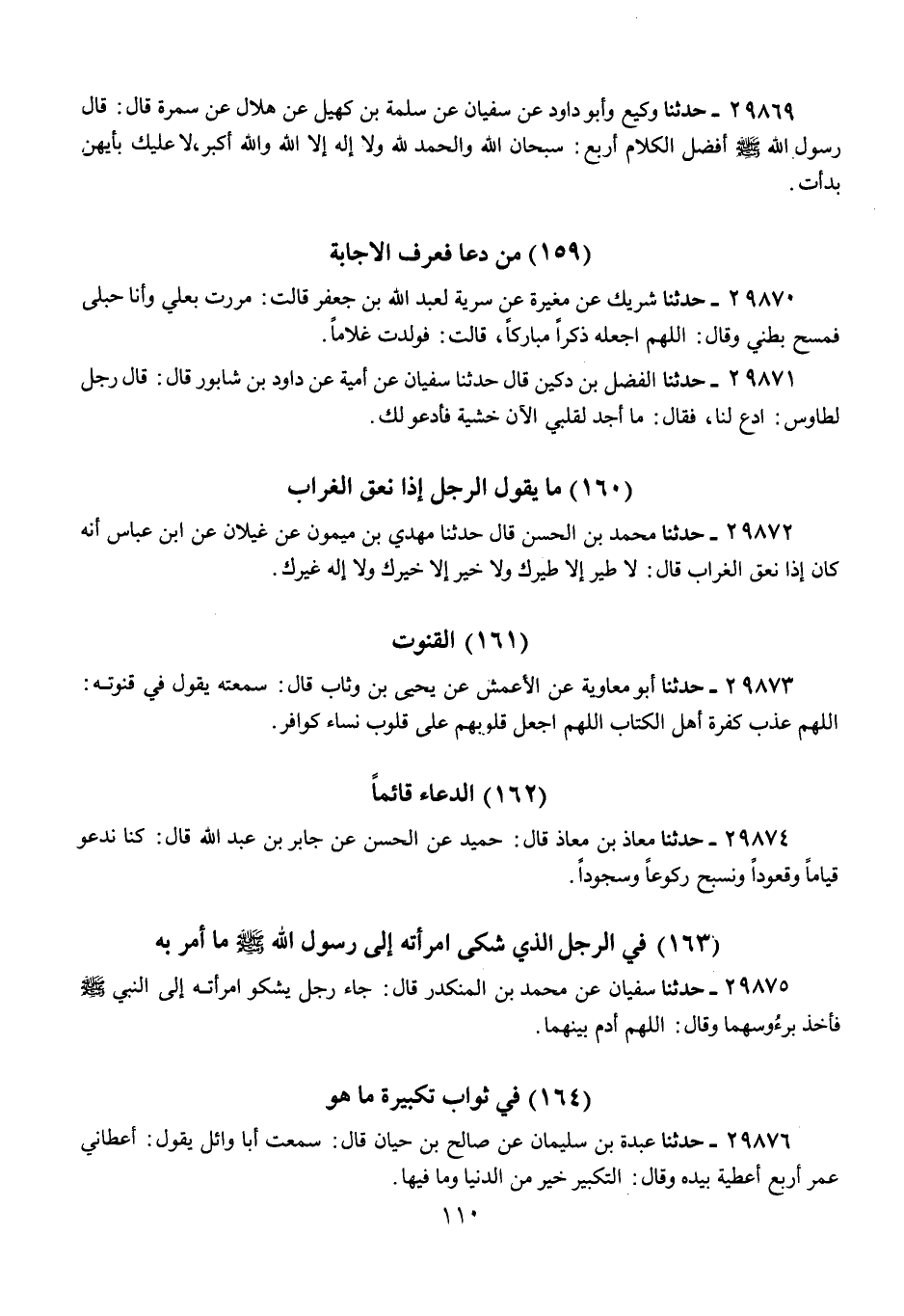 29873 - حَدَّثَنَا أَبُو مُعَاوِيَةَ، عَنِ الْأَعْمَشِ، عَنْ يَحْيَى بْنِ وَثَّابٍ، قَالَ: سَمِعْتُهُ §يَقُولُ فِي قُنُوتِهِ: «اللَّهُمَّ عَذِّبْ كَفَرَةَ أَهْلِ الْكِتَابِ، اللَّهُمَّ اجْعَلْ قُلُوبَهُمْ عَلَى قُلُوبِ نِسَاءٍ كَوَافِرَ»