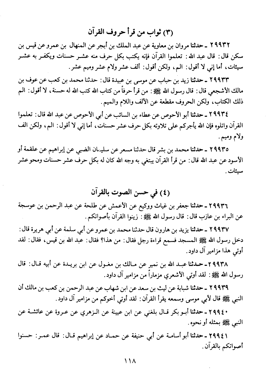29936 - حَدَّثَنَا جَعْفَرُ بْنُ غِيَاثٍ، وَوَكِيعٌ، عَنِ الْأَعْمَشِ، عَنْ طَلْحَةَ، عَنْ عَبْدِ الرَّحْمَنِ بْنِ عَوْسَجَةَ، عَنِ الْبَرَاءِ بْنِ عَازِبٍ، قَالَ: قَالَ رَسُولُ اللَّهِ صَلَّى اللهُ عَلَيْهِ وَسَلَّمَ: «§زَيِّنُوا الْقُرْآنَ بِأَصْوَاتِكُمْ»