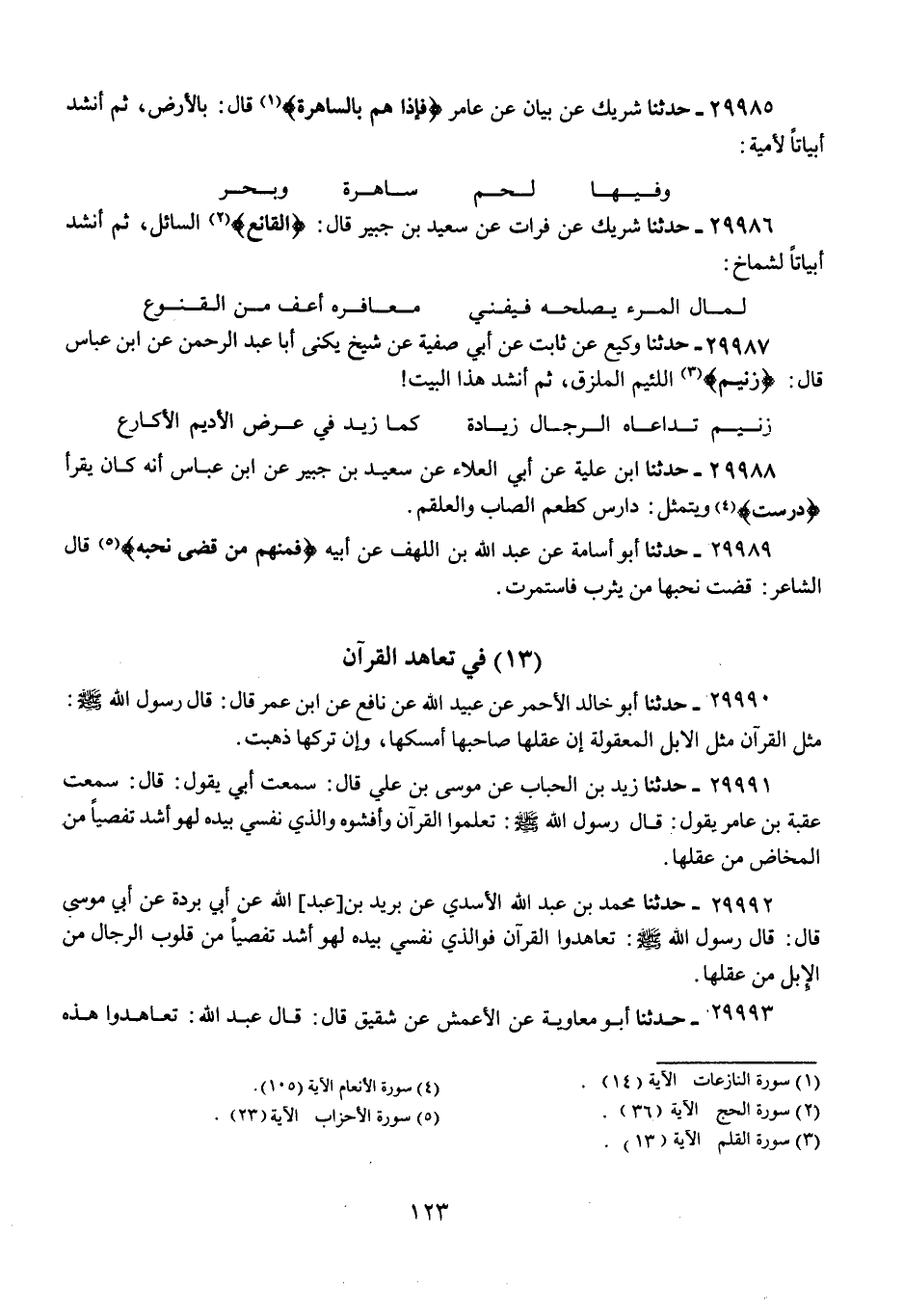 29993 - حَدَّثَنَا أَبُو مُعَاوِيَةَ، عَنِ الْأَعْمَشِ، عَنْ شَقِيقٍ، قَالَ: قَالَ عَبْدُ اللَّهِ: «§تَعَاهَدُوا هَذِهِ الْمَصَاحِفَ»، وَرُبَّمَا قَالَ: «الْقُرْآنَ فَلَهُوَ أَشَدُّ تَفَصِّيًا مِنْ قُلُوبِ الرِّجَالِ مِنَ النَّعَمِ مِنْ عُقُلِهَا»