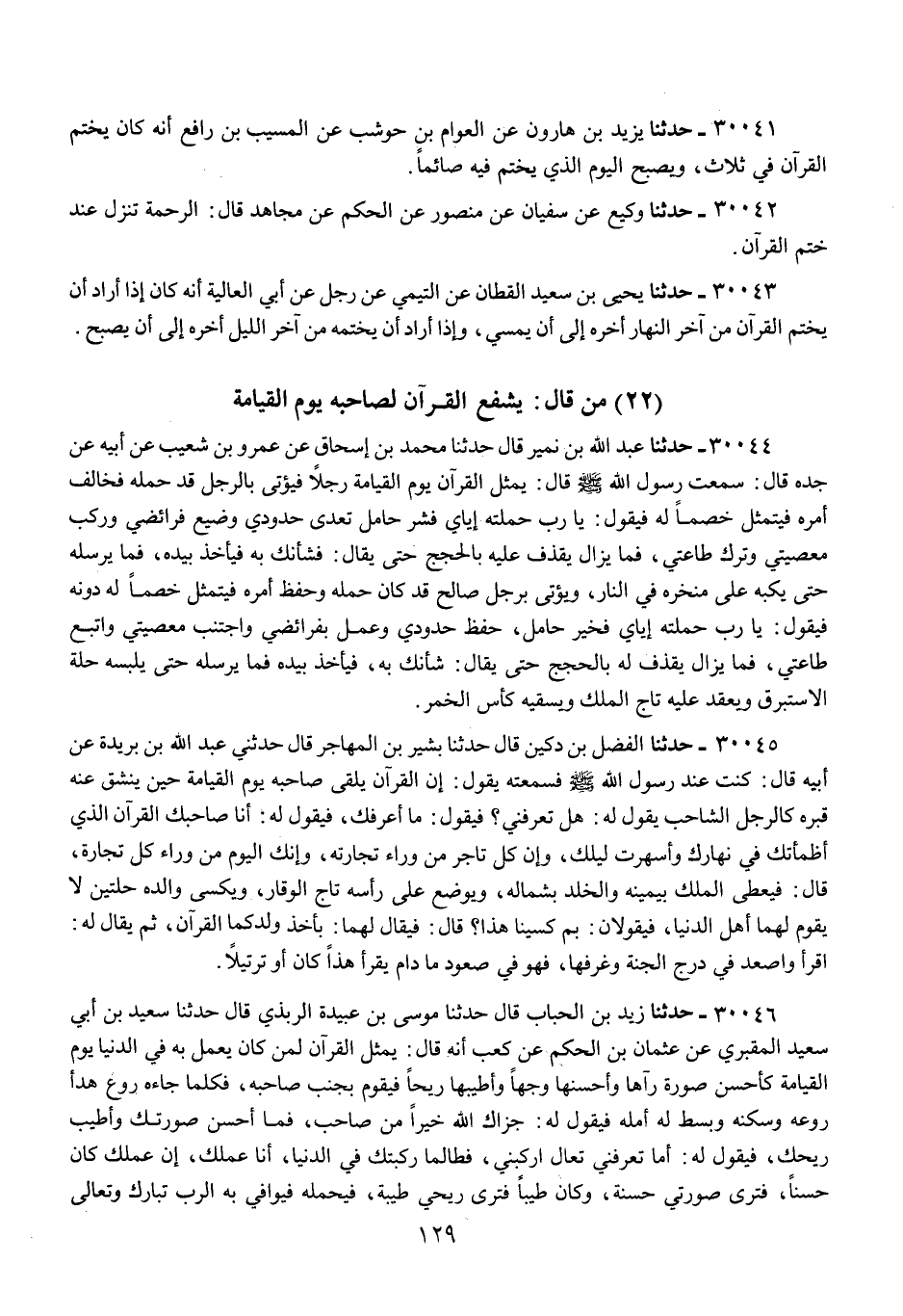 30045 - حَدَّثَنَا الْفَضْلُ بْنُ دُكَيْنٍ، قَالَ: حَدَّثَنَا بَشِيرُ بْنُ الْمُهَاجِرِ، قَالَ: حَدَّثَنِي عَبْدُ اللَّهِ بْنُ بُرَيْدَةَ، عَنْ أَبِيهِ قَالَ: كُنْتُ عِنْدَ رَسُولِ اللَّهِ صَلَّى اللهُ عَلَيْهِ وَسَلَّمَ فَسَمِعْتُهُ يَقُولُ: " إِنَّ §الْقُرْآنَ يَلْقَى صَاحِبَهُ يَوْمَ الْقِيَامَةِ حِينَ يَنْشَقُّ عَنْهُ قَبْرُهُ كَالرَّجُلِ الشَّاحِبِ يَقُولُ لَهُ: هَلْ تَعْرِفُنِي؟، فَيَقُولُ: مَا أَعْرِفُكَ، فَيَقُولُ لَهُ: أَنَا صَاحِبُكَ الْقُرْآنُ الَّذِي أَظْمَأْتُكَ فِي، وَأَسْهَرْتُ لَيْلَكَ، وَإِنَّ كُلَّ تَاجِرٍ مِنْ وَرَاءِ تِجَارَتِهِ، وَإِنَّكَ الْيَوْمَ مِنْ وَرَاءِ كُلِّ تِجَارَةٍ، قَالَ: فَيُعْطَى الْمُلْكَ بِيَمِينِهِ، وَالْخُلْدَ بِشِمَالِهِ، وَيُوضَعُ عَلَى رَأْسِهِ تَاجُ الْوَقَارِ، وَيُكْسَى وَالِدَاهُ حُلَّتَيْنِ، لَا يَقُومُ لَهُمَا أَهْلُ الدُّنْيَا، فَيَقُولَانِ: بِمَ كُسِينَا هَذَا؟، قَالَ: فَيُقَالُ لَهُمَا: بِأَخْذِ وَلَدِكُمَا الْقُرْآنَ، ثُمَّ يُقَالُ لَهُ: اقْرَأْ وَاصْعَدْ فِي دَرَجِ الْجَنَّةِ وَغُرَفِهَا، فَهُوَ فِي صُعُودٍ مَا دَامَ يَقْرَأُ هَذَا كَانَ أَوْ تَرْتِيلًا "