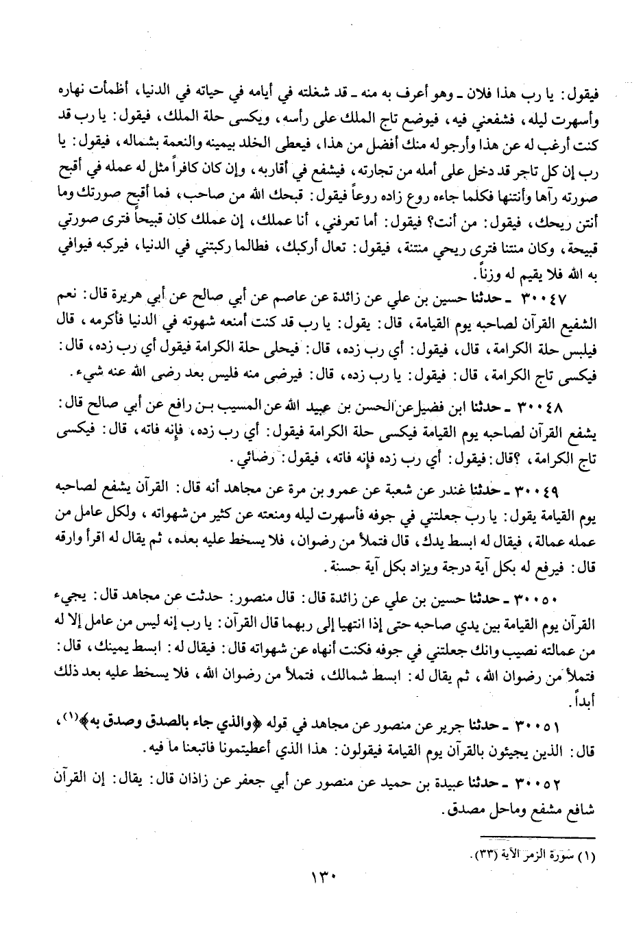 30051 - حَدَّثَنَا جَرِيرٌ، عَنْ مَنْصُورٍ، عَنْ مُجَاهِدٍ: فِي قَوْلِهِ {§وَالَّذِي جَاءَ بِالصِّدْقِ وَصَدَّقَ بِهِ} [الزمر: 33]، قَالَ: " الَّذِينَ يَجِيئُونَ بِالْقُرْآنِ يَوْمَ الْقِيَامَةِ فَيَقُولُونَ: هَذَا الَّذِي أَعْطَيْتُمُونَا فَاتَّبَعْنَا مَا فِيهِ "