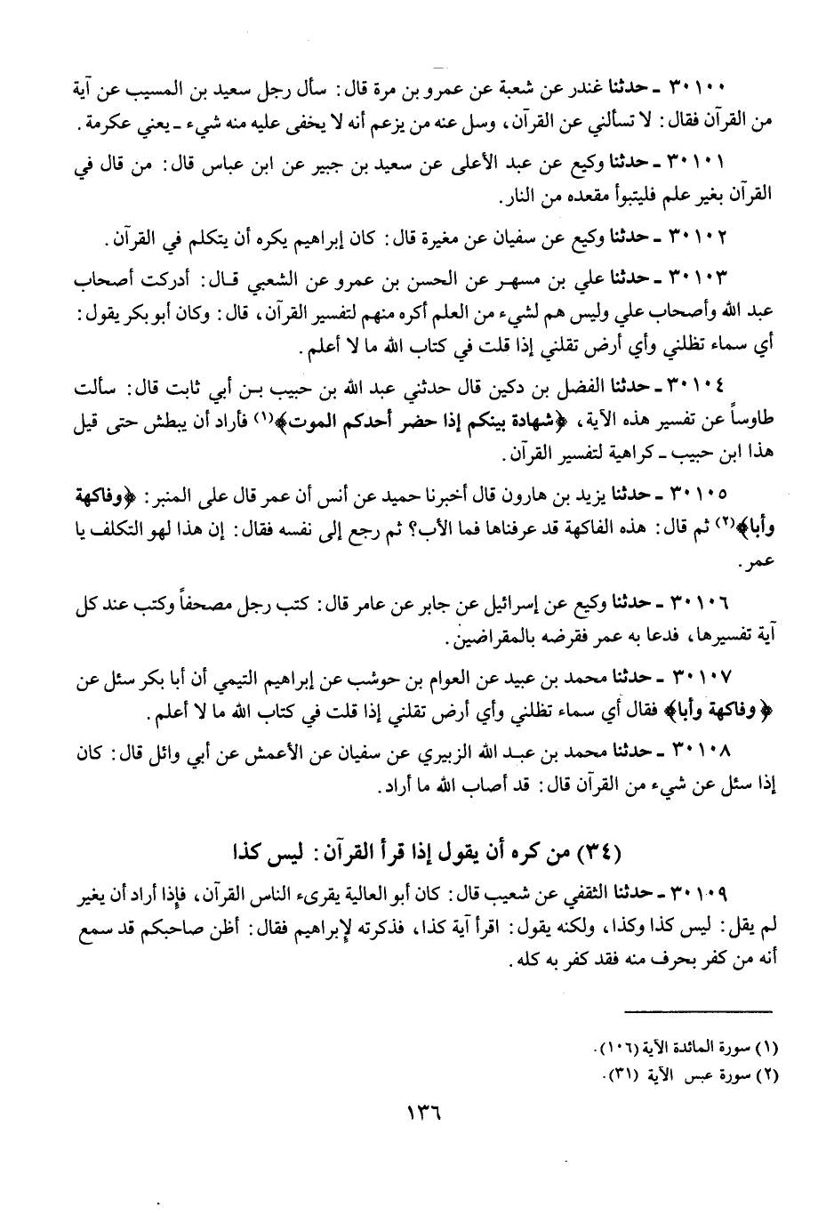 30102 - حَدَّثَنَا وَكِيعٌ، عَنْ سُفْيَانَ، عَنْ مُغِيرَةَ، قَالَ: «كَانَ إِبْرَاهِيمُ §يَكْرَهُ أَنْ يَتَكَلَّمَ فِي الْقُرْآنِ»
