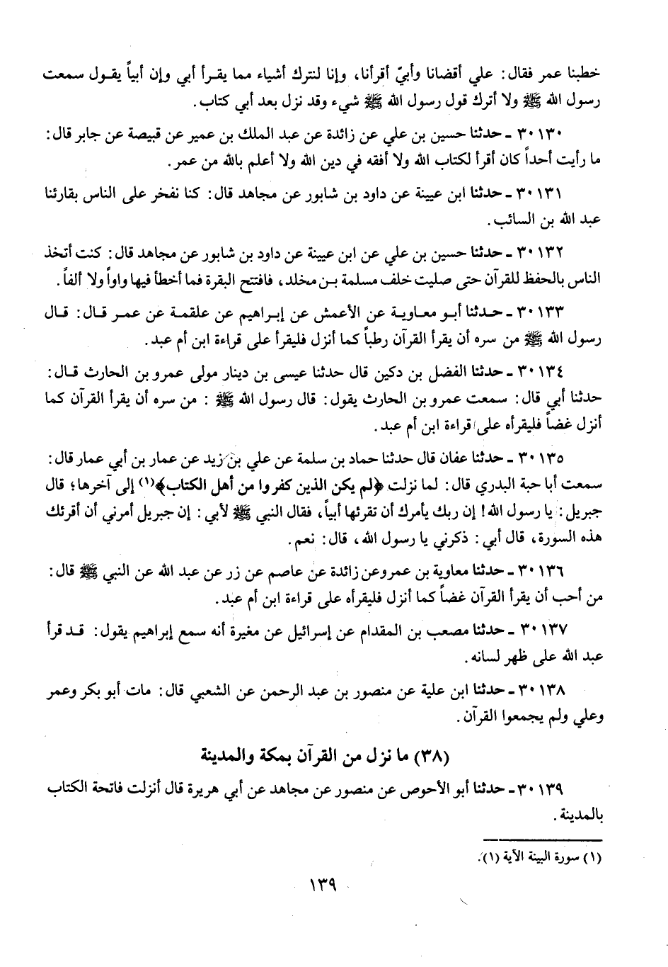 30139 - حَدَّثَنَا أَبُو الْأَحْوَصِ، عَنْ مَنْصُورٍ، عَنْ مُجَاهِدٍ، عَنْ أَبِي هُرَيْرَةَ، قَالَ: «§أُنْزِلَتْ فَاتِحَةُ الْكِتَابِ بِالْمَدِينَةِ»