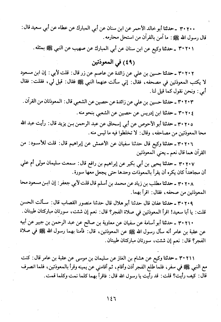 30206 - حَدَّثَنَا وَكِيعٌ، قَالَ: حَدَّثَنَا سُفْيَانُ، عَنِ الْأَعْمَشِ، عَنْ إِبْرَاهِيمَ، قَالَ: قُلْتُ لِلْأَسْوَدِ: §مِنَ الْقُرْآنِ هُمَا؟، قَالَ: «نَعَمْ»، يَعْنِي: الْمُعَوِّذَتَيْنِ