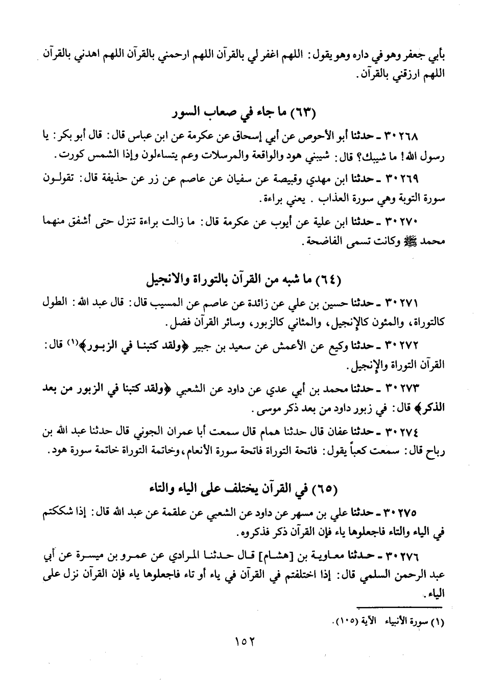 30271 - حَدَّثَنَا حُسَيْنُ بْنُ عَلِيٍّ، عَنْ زَائِدَةَ، عَنْ عَاصِمٍ، عَنِ الْمُسَيِّبِ، قَالَ: قَالَ عَبْدُ اللَّهِ: «§الطُّوَّلُ كَالتَّوْرَاةِ، وَالْمِئُونَ كَالْإِنْجِيلِ، وَالْمَثَانِي كَالزَّبُورِ، وَسَائِرُ الْقُرْآنِ فَضْلٌ»