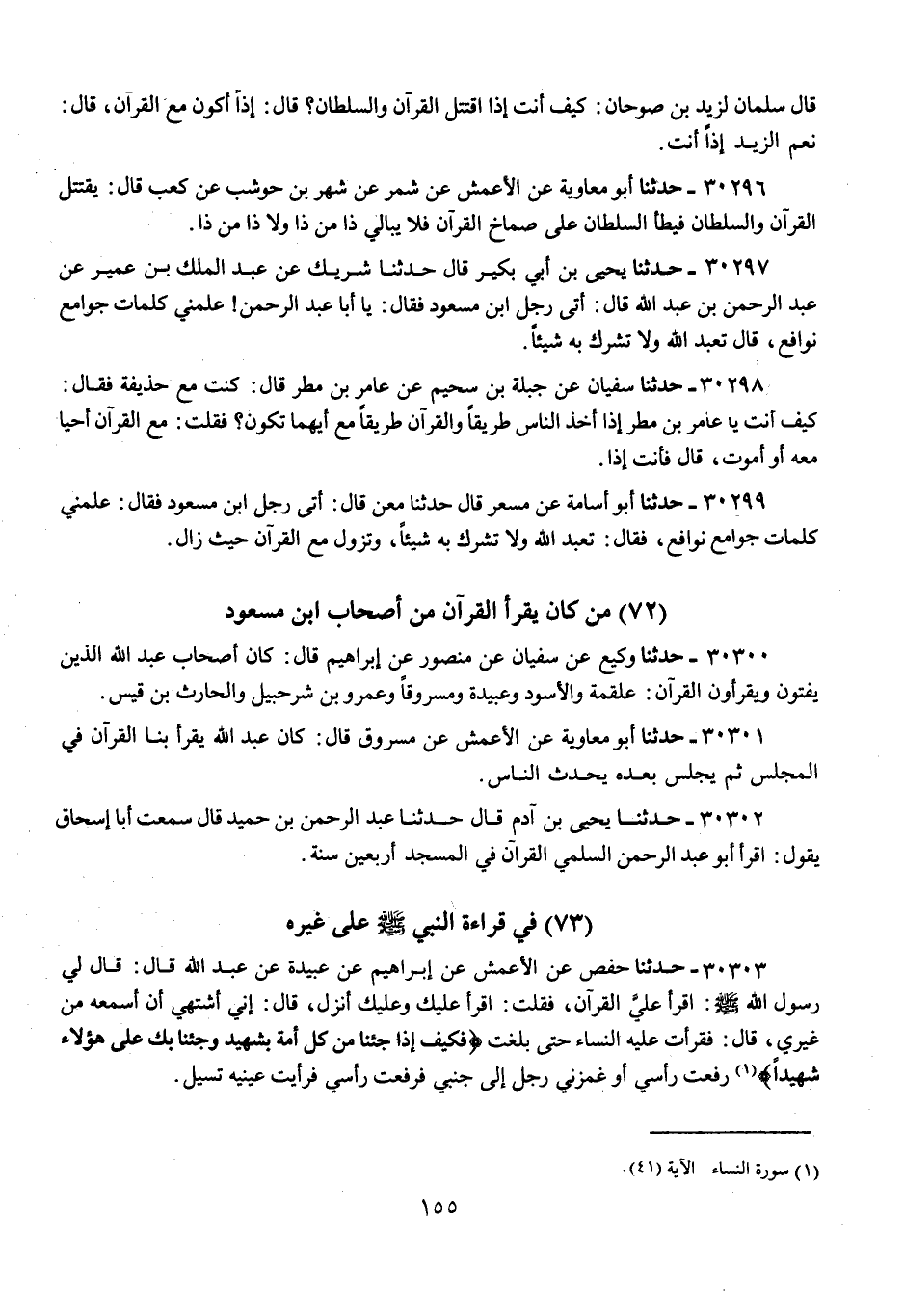 30303 - حَدَّثَنَا حَفْصٌ، عَنِ الْأَعْمَشِ، عَنْ إِبْرَاهِيمَ، عَنْ عُبَيْدَةَ، عَنْ عَبْدِ اللَّهِ، قَالَ: قَالَ لِي رَسُولُ اللَّهِ صَلَّى اللهُ عَلَيْهِ وَسَلَّمَ: «§اقْرَأْ عَلَيَّ الْقُرْآنَ»، فَقُلْتُ: أَقْرَأُ عَلَيْكَ وَعَلَيْكَ أُنْزِلَ، قَالَ: «إِنِّي أَشْتَهِي أَنْ أَسْمَعَهُ مِنْ غَيْرِي»، قَالَ: فَقَرَأْتُ عَلَيْهِ النِّسَاءَ حَتَّى بَلَغْتُ: {فَكَيْفَ إِذَا جِئْنَا مِنْ كُلِّ أُمَّةٍ بِشَهِيدٍ وَجِئْنَا بِكَ عَلَى هَؤُلَاءِ شَهِيدًا} [النساء: 41]، رَفَعْتُ رَأْسِي أَوْ غَمَزَنِي رَجُلٌ إِلَى جَنْبِي، فَرَفَعْتُ رَأْسِي، فَرَأَيْتُ عَيْنَيْهِ تَسِيلُ -[156]-،