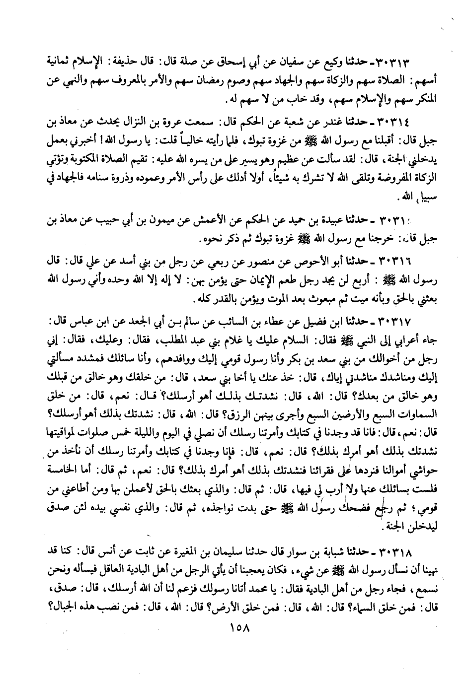 30318 - حَدَّثَنَا شَبَابَةُ بْنُ سَوَّارٍ، قَالَ: حَدَّثَنَا سُلَيْمَانُ بْنُ الْمُغِيرَةِ، عَنْ ثَابِتٍ، عَنْ أَنَسٍ، قَالَ: كُنَّا قَدْ نُهِينَا أَنْ نَسْأَلَ رَسُولَ اللَّهِ صَلَّى اللهُ عَلَيْهِ وَسَلَّمَ عَنْ شَيْءٍ، فَكَانَ يُعْجِبُنَا أَنْ يَأْتِيَ الرَّجُلُ مِنْ أَهْلِ الْبَادِيَةِ الْعَاقِلُ، فَيَسْأَلُهُ وَنَحْنُ نَسْمَعُ، فَجَاءَ رَجُلٌ مِنْ أَهْلِ الْبَادِيَةِ، فَقَالَ: يَا مُحَمَّدُ أَتَانَا رَسُولُكَ فَزَعَمَ لَنَا أَنَّ اللَّهَ أَرْسَلَكَ، قَالَ: «صَدَقَ»، قَالَ: §فَمَنْ خَلَقَ السَّمَاءَ؟، قَالَ: «اللَّهُ»، قَالَ: فَمَنْ خَلَقَ الْأَرْضَ؟، قَالَ: «اللَّهُ»، قَالَ: فَمَنْ نَصَبَ هَذِهِ الْجِبَالَ؟ -[159]-، قَالَ: «اللَّهُ»، قَالَ: فَبِالَّذِي خَلَقَ السَّمَاءَ، وَخَلَقَ الْأَرْضَ، وَنَصَبَ الْجِبَالَ آللَّهُ أَرْسَلَكَ؟، قَالَ: «نَعَمْ»، قَالَ: فَزَعَمَ رَسُولُكَ أَنَّ عَلَيْنَا خَمْسَ صَلَوَاتٍ فِي يَوْمِنَا وَلَيْلَتِنَا؟، قَالَ: «صَدَقَ»، قَالَ: فَبِالَّذِي خَلَقَ السَّمَاءَ وَخَلَقَ الْأَرْضَ وَنَصَبَ الْجِبَالَ، آللَّهُ أَمَرَكَ بِهَذَا؟، قَالَ: «نَعَمْ»، قَالَ: فَزَعَمَ رَسُولُكَ أَنَّ عَلَيْنَا زَكَاةً فِي أَمْوَالِنَا، قَالَ: «صَدَقَ»، قَالَ: فَبِالَّذِي خَلَقَ السَّمَاءَ، وَخَلَقَ الْأَرْضَ، وَنَصَبَ الْجِبَالَ، آللَّهُ أَمَرَكَ بِهَذَا؟، قَالَ: «نَعَمْ»، قَالَ: وَزَعَمَ رَسُولُكَ أَنَّ عَلَيْنَا صَوْمَ رَمَضَانَ فِي سَنَتِنَا، قَالَ: «نَعَمْ، صَدَقَ»، قَالَ: فَبِالَّذِي خَلَقَ السَّمَاءَ وَخَلَقَ الْأَرْضَ وَنَصَبَ الْجِبَالَ آللَّهُ أَمَرَكَ بِهَذَا؟، قَالَ: «نَعَمْ»، قَالَ: زَعَمَ رَسُولُكَ أَنَّ عَلَيْنَا الْحَجَّ مَنِ اسْتَطَاعَ إِلَيْهِ سَبِيلًا، قَالَ: «صَدَقَ»، قَالَ: فَبِالَّذِي خَلَقَ السَّمَاءَ، وَخَلَقَ الْأَرْضَ، وَنَصَبَ الْجِبَالَ آللَّهُ أَمَرَكَ بِهَذَا؟، قَالَ: «نَعَمْ»، ثُمَّ وَلَّى، وَقَالَ: وَالَّذِي بَعَثَكَ بِالْحَقِّ لَا أَزْدَادُ عَلَيْهِ شَيْئًا وَلَا أَنْقُصُ مِنْهُ شَيْئًا، فَقَالَ رَسُولُ اللَّهِ صَلَّى اللهُ عَلَيْهِ وَسَلَّمَ: «إِنْ صَدَقَ دَخَلَ الْجَنَّةَ»