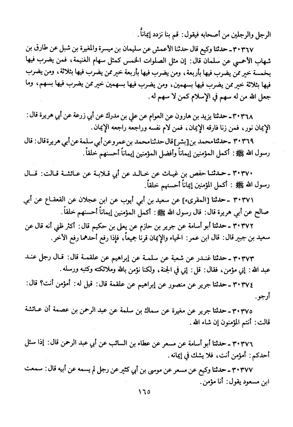 30376 - حَدَّثَنَا أَبُو أُسَامَةَ , عَنْ مِسْعَرٍ , عَنْ عَطَاءِ بْنِ السَّائِبِ , عَنْ أَبِي عَبْدِ الرَّحْمَنِ قَالَ: " §إِذَا سُئِلَ أَحَدُكُمْ: أَمُؤْمِنٌ أَنْتَ , فَلَا يَشُكُّ فِي إِيمَانِهِ "