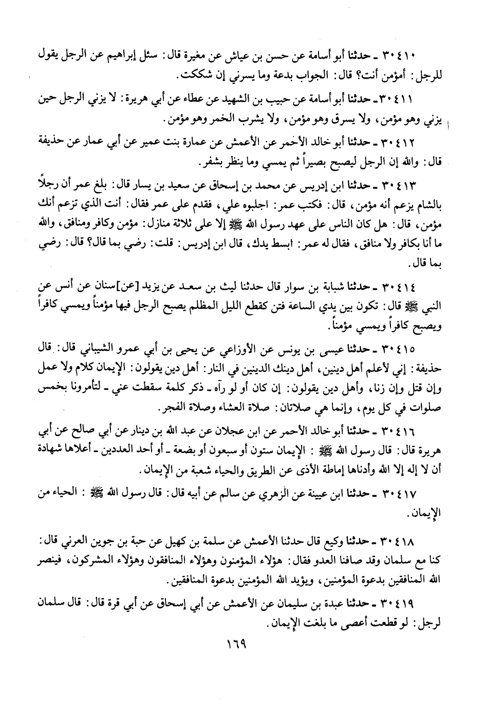 30410 - حَدَّثَنَا أَبُو أُسَامَةَ , عَنْ حَسَنِ بْنِ عَبَّاسٍ , عَنْ مُغِيرَةَ قَالَ: سُئِلَ إِبْرَاهِيمُ عَنِ الرَّجُلِ يَقُولُ لِلرَّجُلِ: §أَمُؤْمِنٌ أَنْتَ؟ قَالَ: «الْجَوَابُ بِدْعَةٌ وَمَا يَسُرُّنِي إِنْ شَكَكْتَ»