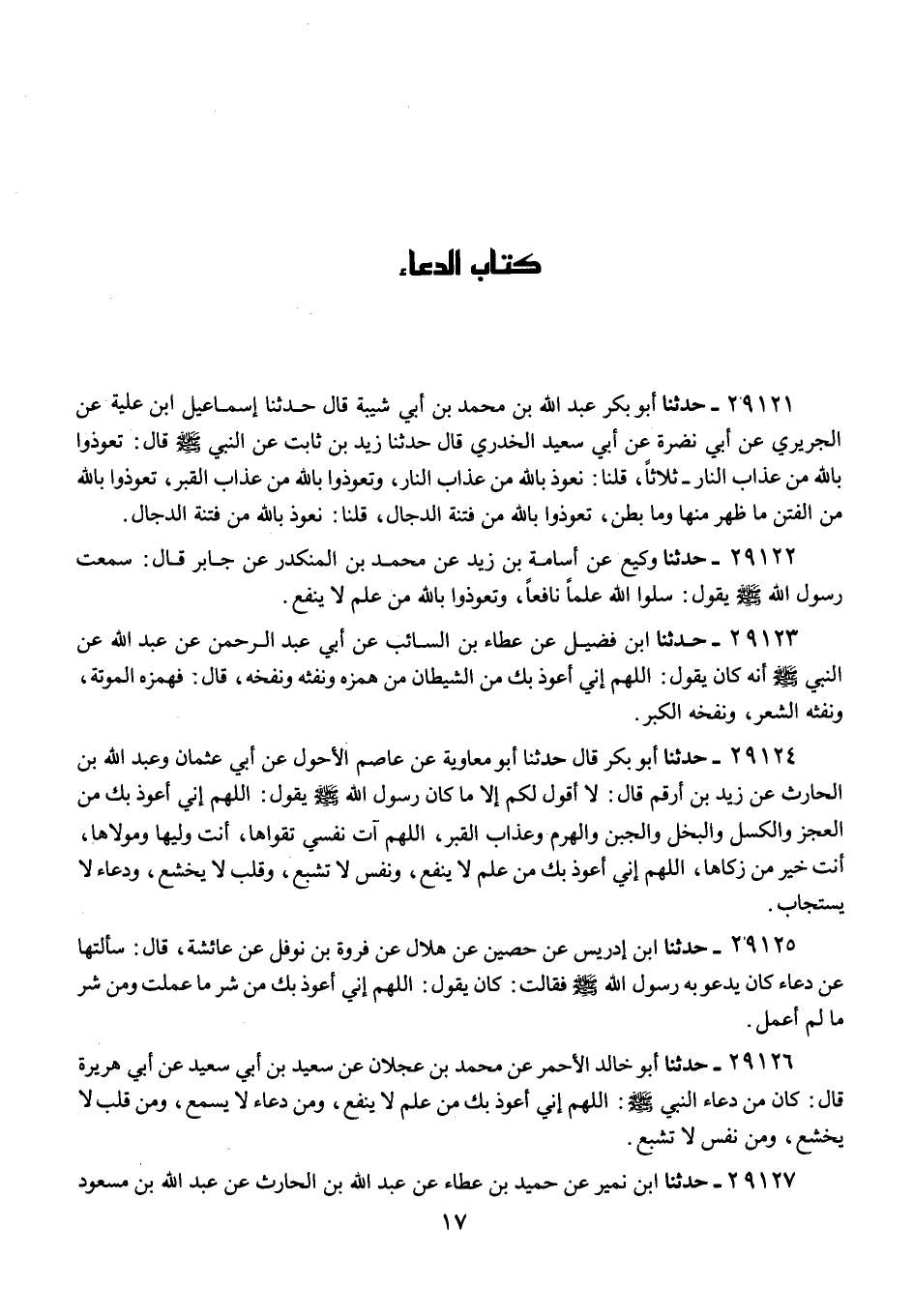 29122 - حَدَّثَنَا وَكِيعٌ، عَنْ أُسَامَةَ بْنِ زَيْدٍ، عَنْ مُحَمَّدِ بْنِ الْمُنْكَدِرِ، عَنْ جَابِرٍ، قَالَ: سَمِعْتُ رَسُولَ اللَّهِ صَلَّى اللهُ عَلَيْهِ وَسَلَّمَ، يَقُولُ: «§سَلُوا اللَّهَ عِلْمًا نَافِعًا، وَتَعَوَّذُوا بِاللَّهِ مِنْ عِلْمٍ لَا يَنْفَعُ»