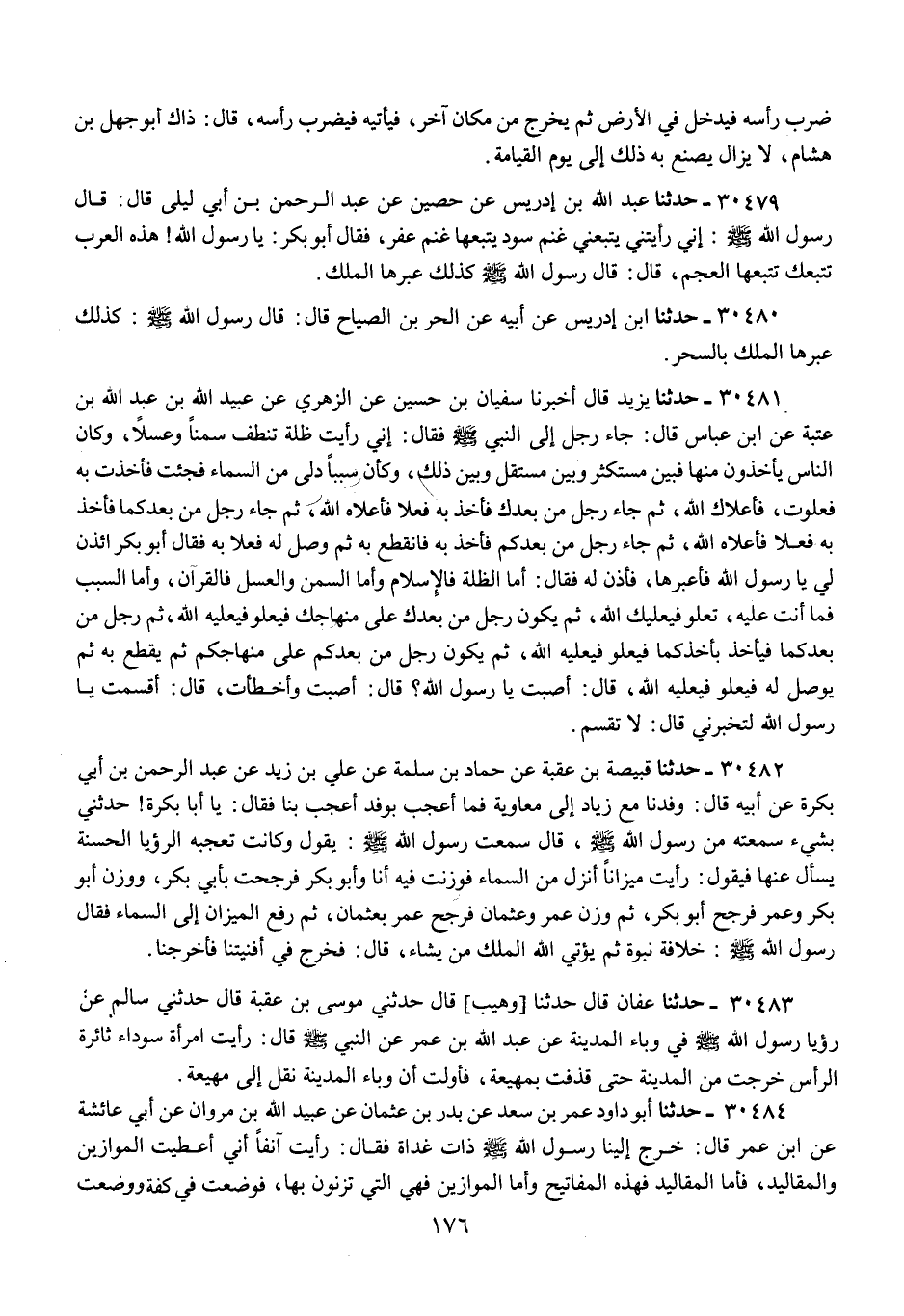 30484 - حَدَّثَنَا أَبُو دَاوُدَ عُمَرُ بْنُ سَعْدٍ , عَنْ بَدْرِ بْنِ عُثْمَانَ، عَنْ عُبَيْدِ اللَّهِ بْنِ مَرْوَانَ، عَنْ أَبِي عَائِشَةَ، عَنِ ابْنِ عُمَرَ قَالَ: خَرَجَ إِلَيْنَا رَسُولُ اللَّهِ صَلَّى اللهُ عَلَيْهِ وَسَلَّمَ ذَاتَ غَدَاةٍ فَقَالَ: «§رَأَيْتُ آنِفًا أَنِّي أُعْطِيتُ الْمَوَازِينَ وَالْمَقَالِيدَ، فَأَمَّا الْمَقَالِيدُ فَهَذِهِ الْمَفَاتِيحُ، وَأَمَّا الْمَوَازِينُ فَهِيَ الَّتِي تَزِنُونَ بِهَا، فَوُضِعْتُ فِي كِفَّةٍ وَوُضِعَتْ أُمَّتِي فِي كِفَّةٍ فَرَجَحْتُ بِهِمْ، فَجِيءَ بِأَبِي بَكْرٍ فَرَجَحَ، ثُمَّ جِيءَ بِعُمَرَ فَرَجَحَ، ثُمَّ جِيءَ بِعُثْمَانَ فَرَجَحَ»، ثُمَّ قَالَ: «رُفِعْتُ»، قَالَ: فَقَالَ لَهُ رَجُلٌ: فَأَيْنَ نَحْنُ؟ قَالَ: «حَيْثُ جَعَلْتُمْ أَنْفُسَكُمْ»