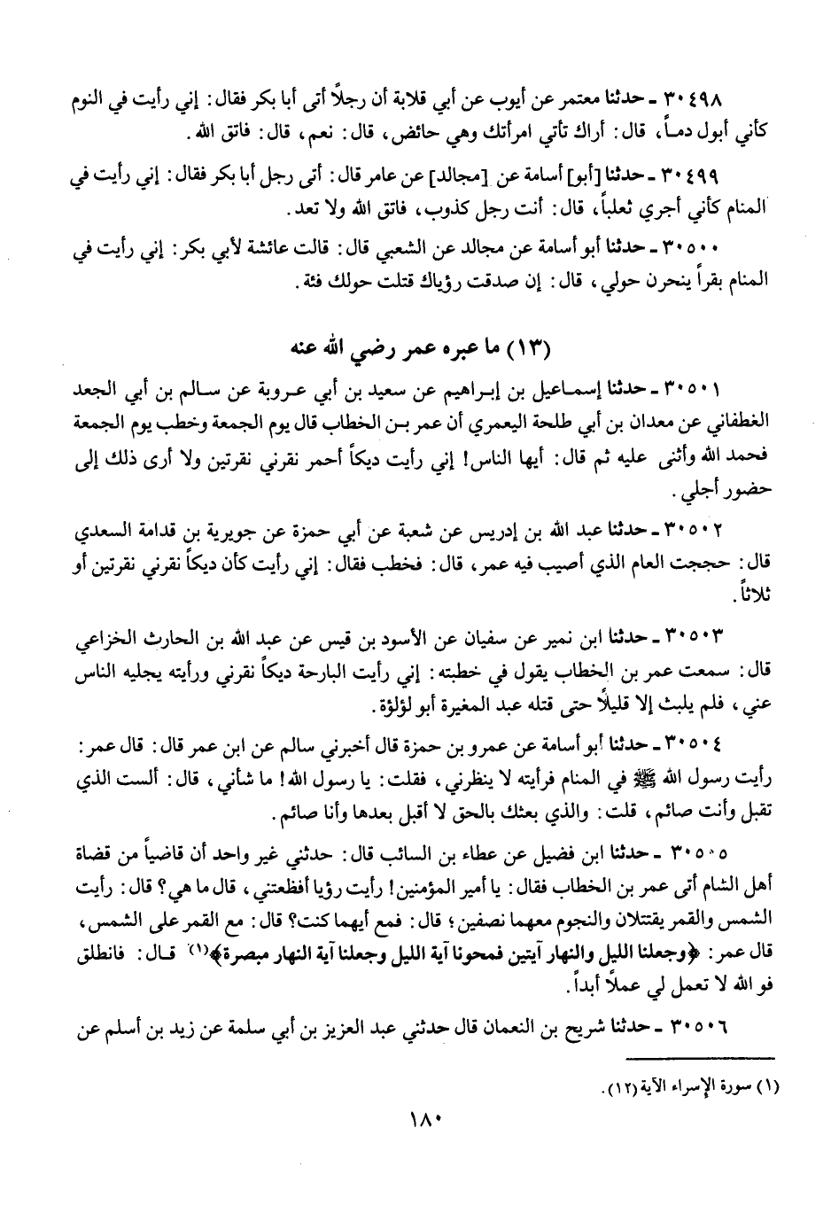 30506 - حَدَّثَنَا سُرَيْجُ بْنُ النُّعْمَانِ، قَالَ: حَدَّثَنِي عَبْدُ الْعَزِيزِ بْنُ أَبِي سَلَمَةَ، عَنْ زَيْدِ بْنِ أَسْلَمَ، عَنْ أَبِيهِ قَالَ: خَطَبَ عُمَرُ بْنُ الْخَطَّابِ النَّاسَ فَقَالَ: «إِنِّي §رَأَيْتُ فِي مَنَامِي دِيكًا أَحْمَرَ نَقَرَنِي عَلَى مَقْعَدِ إِزَارِي ثَلَاثَ نَقَرَاتٍ»، فَاسْتَعْبَرَتْهَا أَسْمَاءُ بِنْتُ قَيْسٍ فَقَالَتْ: إِنْ صَدَقَتْ رُؤْيَاكَ قَتَلَكَ رَجُلٌ مِنَ الْعَجَمِ