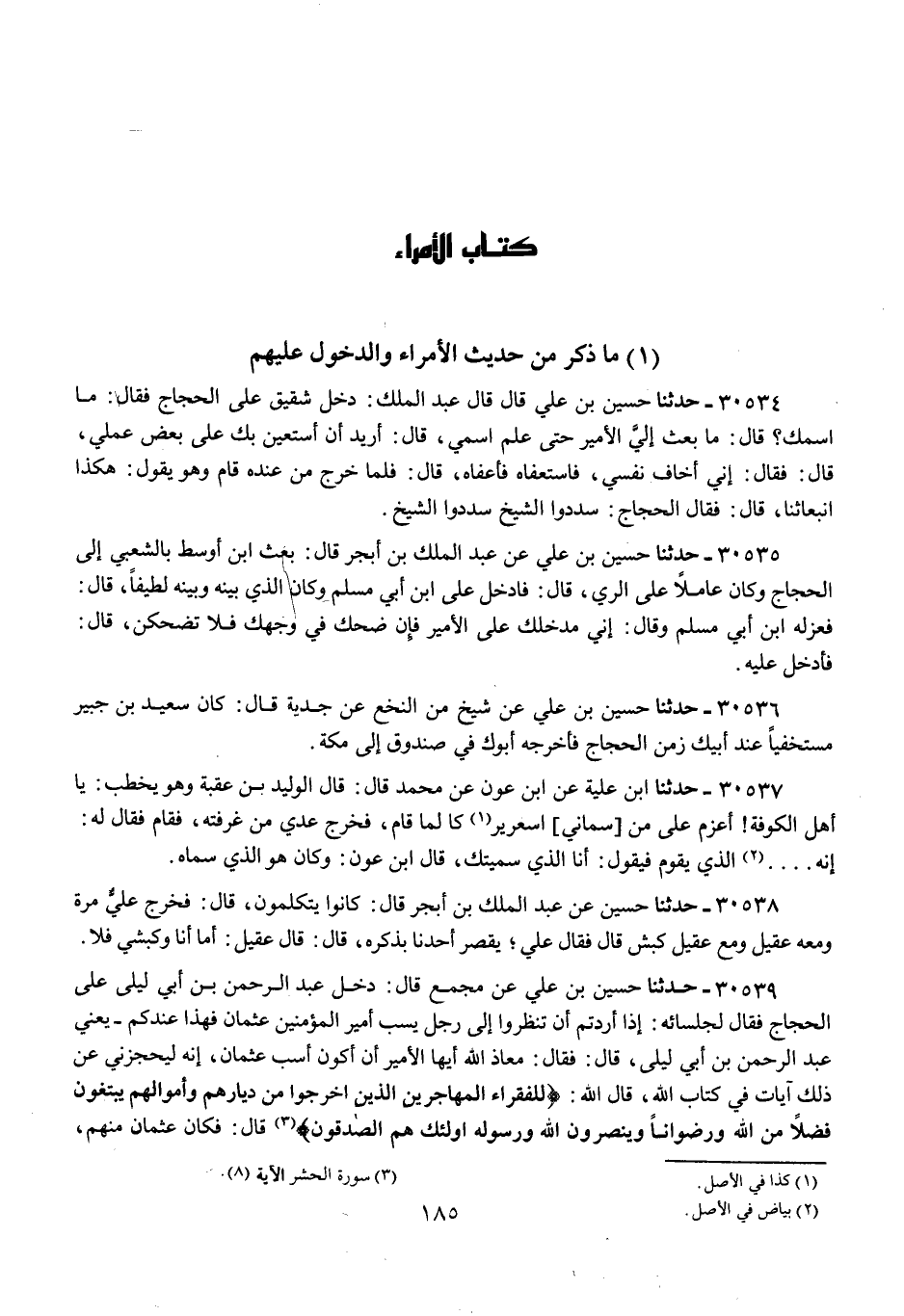 30534 - حَدَّثَنَا حُسَيْنُ بْنُ عَلِيٍّ قَالَ: قَالَ عَبْدُ الْمَلِكِ: دَخَلَ شَقِيقٌ عَلَى الْحَجَّاجِ فَقَالَ: «مَا اسْمُكَ؟»، قَالَ: مَا بَعَثَ إِلَيَّ الْأَمِيرُ حَتَّى عَلِمَ اسْمِي قَالَ: «أُرِيدُ أَنْ أَسْتَعِينَ بِكَ عَلَى بَعْضِ عَمَلِي»، قَالَ: فَقَالَ: إِنِّي أَخَافُ نَفْسِي، فَاسْتَعْفَاهُ فَأَعْفَاهُ، قَالَ: فَلَمَّا خَرَجَ مِنْ عِنْدِهِ قَامَ وَهُوَ يَقُولُ: هَكَذَا انْبِعَاثُنَا، قَالَ: فَقَالَ الْحُجَّاجُ: «§سَدِّدُوا الشَّيْخَ سَدِّدُوا الشَّيْخَ»