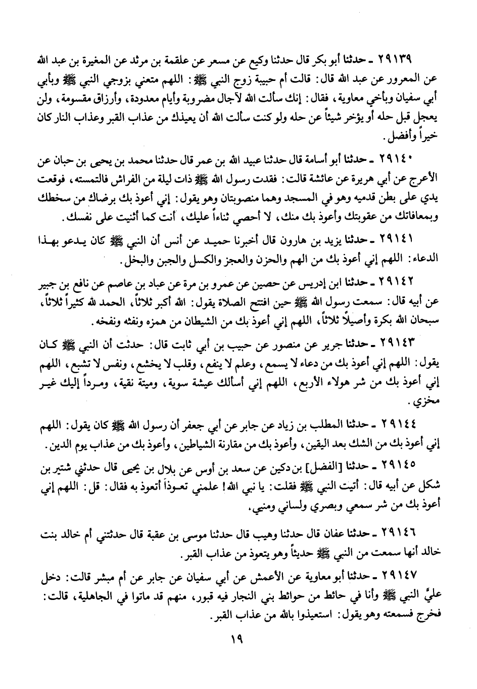 29139 - حَدَّثَنَا أَبُو بَكْرٍ قَالَ: حَدَّثَنَا وَكِيعٌ، عَنْ مِسْعَرٍ، عَنْ عَلْقَمَةَ بْنِ مَرْثَدٍ، عَنِ الْمُغِيرَةِ بْنِ عَبْدِ اللَّهِ، عَنِ الْمَعْرُورِ، عَنْ عَبْدِ اللَّهِ، قَالَ: قَالَتْ أُمُّ حَبِيبَةَ زَوْجُ النَّبِيِّ صَلَّى اللهُ عَلَيْهِ وَسَلَّمَ: اللَّهُمَّ مَتِّعْنِي بِزَوْجِي النَّبِيِّ صَلَّى اللهُ عَلَيْهِ وَسَلَّمَ، وَبِأَبِي أَبِي سُفْيَانَ، وَبِأَخِي مُعَاوِيَةَ، فَقَالَ: «§إِنَّكِ سَأَلْتِ اللَّهَ لِآجَالٍ مَضْرُوبَةٍ، وَأَيَّامٍ مَعْدُودَةٍ، وَأَرْزَاقٍ مَقْسُومَةٍ، وَلَنْ يُعَجِّلَ شَيْئًا قَبْلَ حِلِّهِ، أَوْ يُؤَخِّرَ شَيْئًا عَنْ حِلِّهِ، وَلَوْ كُنْتِ سَأَلْتِ اللَّهَ أَنْ يُعِيذَكِ مِنْ عَذَابِ الْقَبْرِ، وَعَذَابِ النَّارِ كَانَ خَيْرًا وَأَفْضَلَ»