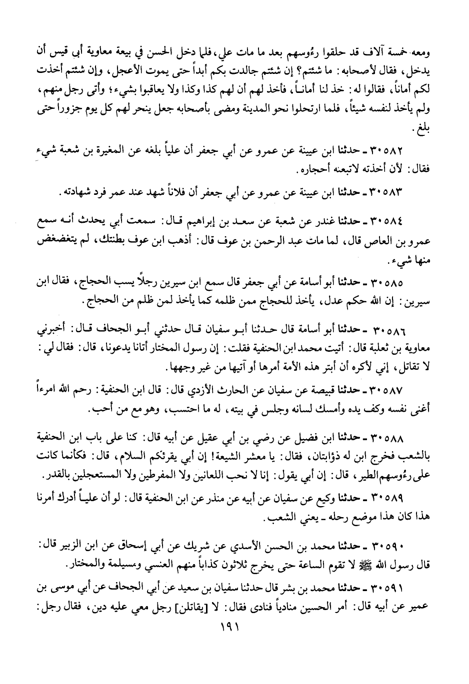 30586 - حَدَّثَنَا أَبُو أُسَامَةَ قَالَ حَدَّثَنَا سُفْيَانَ قَالَ حَدَّثَنِي أَبُو الْجَحَّافِ قَالَ: أَخْبَرَنِي مُعَاوِيَةُ بْنُ ثَعْلَبَةٍ قَالَ: أَتَيْتُ مُحَمَّدَ بْنَ الْحَنَفِيَّةِ فَقُلْتُ: إِنَّ رَسُولَ الْمُخْتَارِ أَتَانَا يَدْعُونَا , قَالَ: فَقَالَ لِي: «§لَا تُقَاتِلْ , إِنِّي لَأَكْرَهُ أَنْ أَبْتُرَ هَذِهِ الْأُمَّةَ أَمْرَهَا أَوْ آتِيهَا مِنْ غَيْرِ وَجْهِهَا»