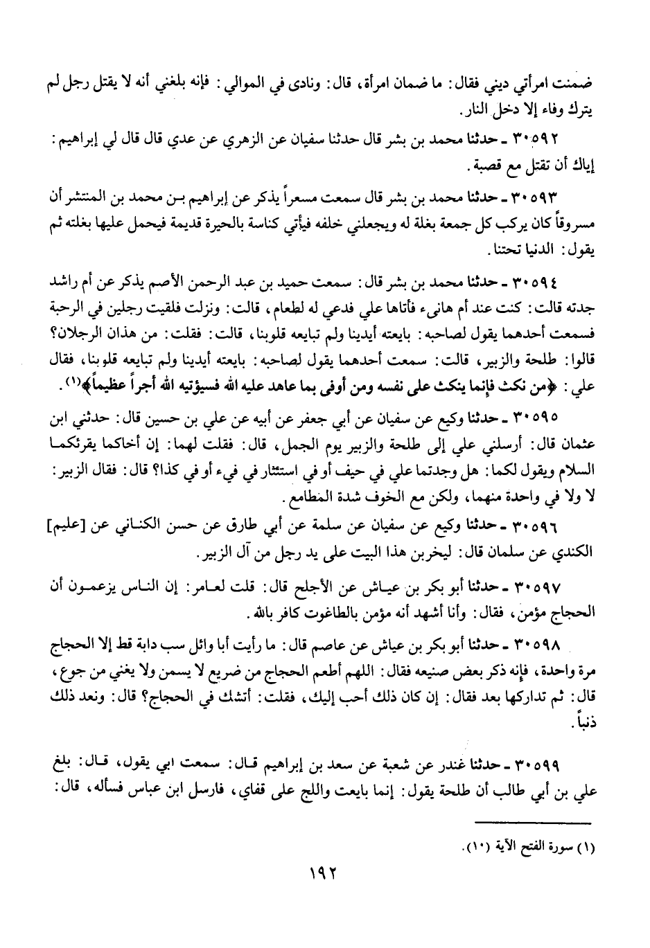 30594 - حَدَّثَنَا مُحَمَّدُ بْنُ بِشْرٍ قَالَ: سَمِعْتُ حُمَيْدَ بْنَ عَبْدِ الرَّحْمَنِ الْأَصَمِّ يَذْكُرُ عَنْ أُمِّ رَاشِدٍ جَدَّتِهِ قَالَتْ: كُنْتُ عِنْدَ أُمِّ هَانِئٍ فَأَتَاهَا عَلِيٌّ فَدُعِيَ لَهُ بِطَعَامٍ , قَالَتْ: وَنَزَلْتُ فَلَقِيتُ رَجُلَيْنِ فِي الرَّحْبَةِ فَسَمِعْتُ أَحَدَهُمَا يَقُولُ لِصَاحِبِهِ: بَايَعَتْهُ أَيْدِينَا وَلَمْ تُبَايِعْهُ قُلُوبُنَا , قَالَتْ: فَقُلْتُ: مَنْ هَذَانِ الرَّجُلَانِ؟ قَالُوا: طَلْحَةُ وَالزُّبَيْرُ , قَالَتْ: سَمِعْتُ أَحَدُهُمَا يَقُولُ لِصَاحِبِهِ: بَايَعَتْهُ أَيْدِينَا وَلَمْ تُبَايِعْهُ قُلُوبُنَا , فَقَالَ عَلِيٌّ " {§فَمَنْ نَكَثَ فَإِنَّمَا يَنْكُثُ عَلَى نَفْسِهِ وَمَنْ أَوْفَى بِمَا عَاهَدَ عَلَيْهُ اللَّهَ فَسَيُؤْتِيهِ أَجْرًا عَظِيمًا} [الفتح: 10] "