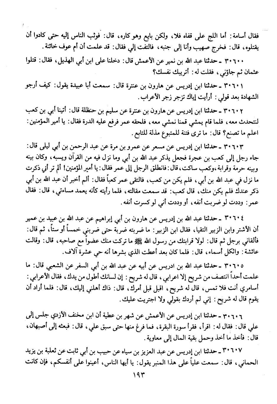 30600 - حَدَّثَنَا عَبْدُ اللَّهِ بْنُ نُمَيْرٍ عَنِ الْأَعْمَشِ قَالَ: دَخَلْنَا عَلَى ابْنِ أَبِي الْهُذَيْلِ , فَقَالَ: قَتَلُوا عُثْمَانَ ثُمَّ جَاءُونِي , فَقُلْتُ لَهُ: «§أَتَرِيبُكَ نَفْسُكَ؟»