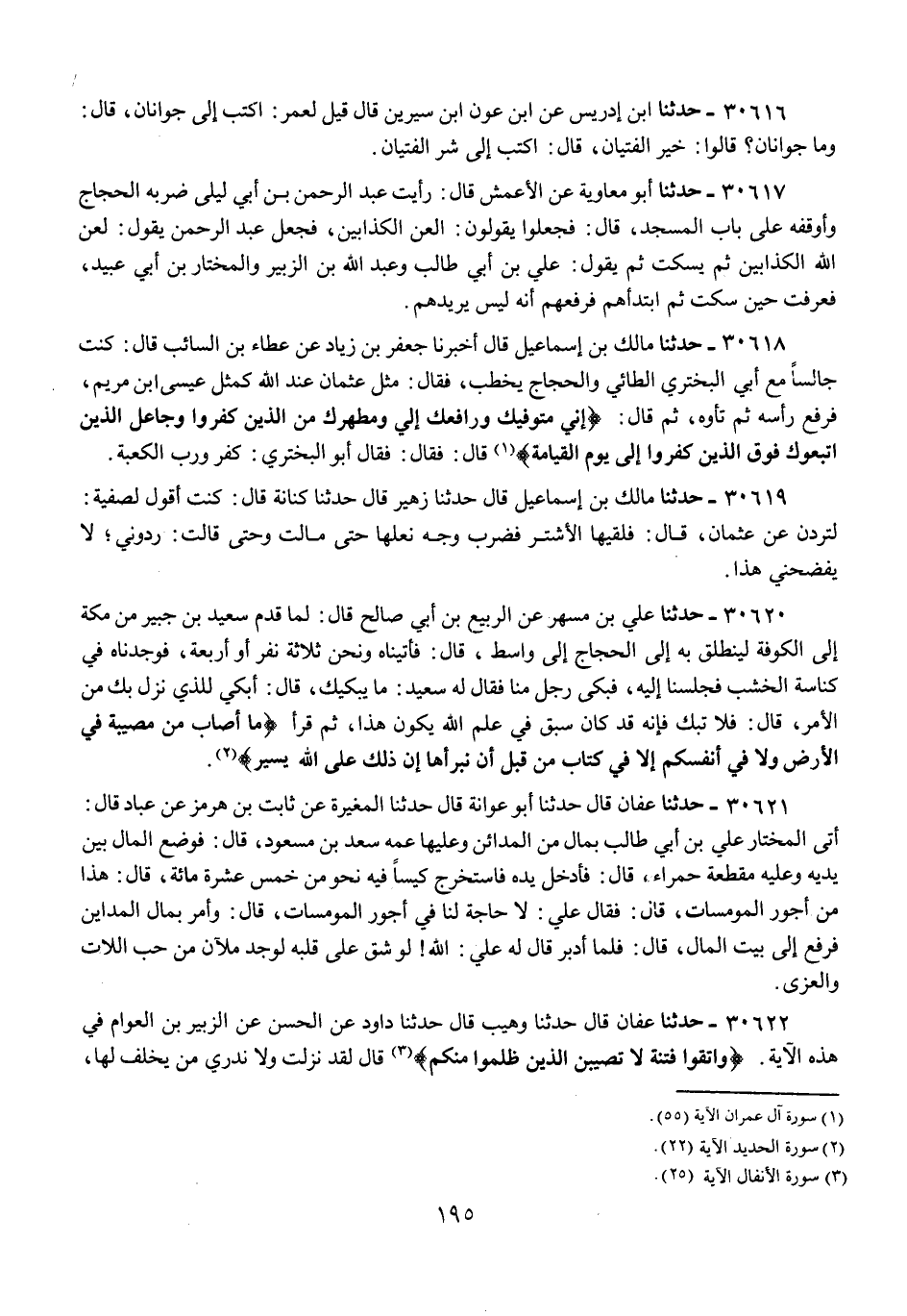 30618 - حَدَّثَنَا مَالِكُ بْنُ إِسْمَاعِيلَ قَالَ: أَخْبَرَنَا جَعْفَرُ بْنُ زِيَادٍ عَنْ عَطَاءِ بْنِ السَّائِبِ قَالَ: كُنْتُ جَالِسًا مَعَ أَبِي الْبُحْتُرِيِّ الطَّائِيِّ وَالْحَجَّاجُ يَخْطُبُ , فَقَالَ: مَثَلُ عُثْمَانَ عِنْدَ اللَّهِ كَمَثَلِ عِيسَى ابْنِ مَرْيَمَ ; قَالَ: فَرَفَعَ رَأْسَهُ ثُمَّ تَأَوَّهَ , ثُمَّ قَالَ: {§إِنِّي مُتَوَفِّيكَ وَرَافِعُكَ إِلَيَّ وَمُطَهِّرُكَ مِنَ الَّذِينَ كَفَرُوا وَجَاعِلُ الَّذِينَ اتَّبَعُوكَ فَوْقَ الَّذِينَ كَفَرُوا إِلَى يَوْمِ الْقِيَامَةِ} [آل عمران: 55] قَالَ: فَقَالَ أَبُو الْبُحْتُرِيِّ: «كَفَرَ وَرَبِّ الْكَعْبَةِ»