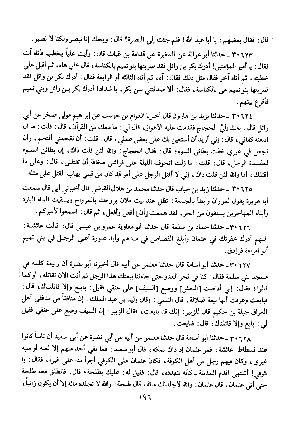 30628 - حَدَّثَنَا أَبُو أُسَامَةَ قَالَ: حَدَّثَنَا مُعْتَمِرٌ عَنْ أَبِيهِ عَنْ أَبِي نَضْرَةَ عَنْ أَبِي سَعِيدٍ أَنَّ نَاسًا كَانُوا عِنْدَ فُسْطَاطِ عَائِشَةَ , فَمَرَّ عُثْمَانُ إِذْ ذَاكَ بِمَكَّةَ، قَالَ أَبُو سَعِيدٍ: فَمَا بَقِيَ أَحَدٌ مِنْهُمْ إِلَّا لَعَنَهُ أَوْ سَبَّهُ غَيْرِي , وَكَانَ فِيهِمْ رَجُلٌ مِنْ أَهْلِ الْكُوفَةِ , فَكَانَ عُثْمَانُ عَلَى الْكُوفِيِّ أَجْرَأَ مِنِّي عَلَى غَيْرِهِ , فَقَالَ: يَا كُوفِيُّ , أَشْتَهِي أَقْدَمُ الْمَدِينَةَ كَأَنَّهُ يَتَهَدَّدُهُ , قَالَ: فَقِيلَ لَهُ: عَلَيْكَ بِطَلْحَةِ , قَالَ: فَانْطَلَقَ مَعَهُ طَلْحَةُ حَتَّى أَتَى عُثْمَانَ , قَالَ عُثْمَانُ: وَاللَّهِ لَأَجْلِدَنَّكَ مِائَةً , قَالَ طَلْحَةُ: «وَاللَّهِ §لَا تَجْلِدُهُ مِائَةً إِلَّا أَنْ يَكُونَ زَانِيًا» , فَقَالَ: لَأَحْرِمَنَّكَ عَطَاءَكَ , قَالَ: فَقَالَ طَلْحَةُ: «إِنَّ اللَّهَ سَيَرْزُقُهُ»