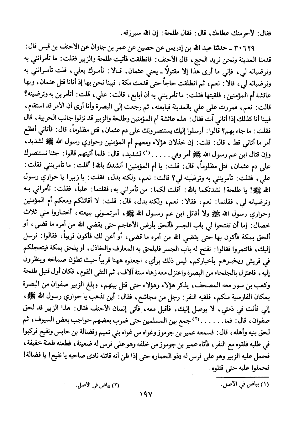 30629 - حَدَّثَنَا عَبْدُ اللَّهِ بْنُ إِدْرِيسَ عَنْ حُصَيْنٍ عَنْ عُمَرَ بْنِ جَاوَانَ عَنِ الْأَحْنَفِ بْنِ قَيْسٍ قَالَ: «قَدِمْنَا الْمَدِينَةَ وَنَحْنُ نُرِيدُ الْحَجَّ» , قَالَ الْأَحْنَفُ: " فَانْطَلَقْتُ فَأَتَيْتُ طَلْحَةَ وَالزُّبَيْرَ فَقُلْتُ: مَا تَأْمُرَانِنِي بِهِ وَتَرْضَيَانِهِ لِي , فَإِنِّي مَا أَرَى هَذَا إِلَّا مَقْتُولًا " يَعْنِي عُثْمَانَ , قَالَا: §نَأْمُرُكَ بِعَلِيٍّ , قُلْتُ: «تَأْمُرَانِنِي بِهِ وَتَرْضَيَانِهِ لِي» , قَالَا: نَعَمْ , " ثُمَّ انْطَلَقْتُ حَاجًّا حَتَّى قَدِمْتُ مَكَّةَ , فَبَيْنَا نَحْنُ بِهَا إِذْ أَتَانَا قَتْلُ عُثْمَانَ , وَبِهَا عَائِشَةُ أُمُّ الْمُؤْمِنِينَ , فَلَقِيتُهَا فَقُلْتُ: مَا تَأْمُرِينَنِي بِهِ أَنْ أُبَايِعَ " , قَالَتْ: عَلِيٌّ , قُلْتُ: «أَتَأْمُرِينَ بِهِ وَتَرْضِينَهُ؟» قَالَتْ: نَعَمْ , «فَمَرَرْتُ عَلَى عَلِيٍّ بِالْمَدِينَةِ فَبَايَعْتُهُ , ثُمَّ رَجَعْتُ إِلَى الْبَصْرَةِ وَأَنَا أَرَى أَنَّ الْأَمْرَ قَدِ اسْتَقَامَ , فَبَيْنَا أَنَا كَذَلِكَ إِذْ أَتَانِي آتٍ» فَقَالَ: هَذِهِ عَائِشَةُ أُمُّ الْمُؤْمِنِينَ وَطَلْحَةُ وَالزُّبَيْرُ قَدْ نَزَلُوا جَانِبَ الْحَرْبِيَّةِ ; قَالَ فَقُلْتُ: «مَا جَاءَ بِهِمْ؟» قَالُوا: أَرْسَلُوا إِلَيْكَ يَسْتَنْصِرُونَكَ عَلَى دَمِ عُثْمَانَ , قُتِلَ مَظْلُومًا , قَالَ: «فَأَتَانِي أَفْظَعُ أَمْرٍ مَا أَتَانِي قَطُّ» , قَالَ: قُلْتُ: «إِنَّ خِذْلَانَ هَؤُلَاءِ وَمَعَهُمْ أُمُّ الْمُؤْمِنِينَ وَحَوَارِيُّ رَسُولِ اللَّهِ صَلَّى اللهُ عَلَيْهِ وَسَلَّمَ لَشَدِيدٌ , وَإِنَّ قِتَالَ ابْنِ عَمِّ رَسُولِ اللَّهِ صَلَّى اللهُ عَلَيْهِ وَسَلَّمَ أَمَرُّ وَقَدْ أَمَرُونِي لِبَيْعَتِهِ لَشَدِيدٌ» , قَالَ: «فَلَمَّا أَتَيْتُهُمْ» قَالُوا: جِئْنَا نَسْتَنْصِرُكَ عَلَى دَمِ عُثْمَانَ ; قُتِلَ مَظْلُومًا , قَالَ: قُلْتُ: " يَا أُمَّ الْمُؤْمِنِينَ , أُنْشِدُكَ بِاللَّهِ , أَقُلْتِ؟: مَا تَأْمُرِينَنِي؟ " فَقَالَتْ: عَلِيٌّ , فَقُلْتُ: «تَأْمُرِينَنِي بِهِ وَتَرْضِينَهُ لِي؟» قَالَتْ: نَعَمْ , وَلَكِنَّهُ بَدَّلَ , فَقُلْتُ: " يَا زُبَيْرُ , يَا حَوَارِيَّ رَسُولِ اللَّهِ صَلَّى اللهُ عَلَيْهِ وَسَلَّمَ , يَا طَلْحَةُ , نَشَدْتُكُمَا بِاللَّهِ: أَقُلْتُ لَكُمَا: مَنْ تَأْمُرَانِي بِهِ , فَقُلْتُمَا: عَلِيًّا , فَقُلْتُ: تَأْمُرَانِي بِهِ وَتَرْضَيَانِهِ لِي , فَقُلْتُمَا: نَعَمْ " , فَقَالَا: نَعَمْ , وَلَكِنَّهُ بَدَّلَ قَالَ: قُلْتُ: " لَا أُقَاتِلُكُمْ وَمَعَكُمْ أُمُّ الْمُؤْمِنِينَ وَحَوَارِيُّ رَسُولِ اللَّهِ صَلَّى اللهُ عَلَيْهِ وَسَلَّمَ وَلَا أُقَاتِلُ ابْنَ عَمِّ رَسُولِ اللَّهِ صَلَّى اللهُ عَلَيْهِ وَسَلَّمَ أَمَرْتُمُونِي بِبَيْعَتِهِ , اخْتَارُوا مِنِّي ثَلَاثَ خِصَالٍ: إِمَّا أَنْ تَفْتَحُوا لِي بَابَ الْجِسْرِ فَأَلْحَقَ بِأَرْضِ الْأَعَاجِمِ حَتَّى يَقْضِيَ اللَّهُ مِنْ أَمْرِهِ مَا قَضَى , أَوْ أَلْحَقَ بِمَكَّةَ فَأَكُونَ بِهَا حَتَّى يَقْضِيَ اللَّهُ مِنْ أَمْرِهِ مَا قَضَى , أَوْ أَعْتَزِلُ لَكَ فَأَكُونَ قَرِيبًا " , فَقَالُوا: نُرْسِلُ إِلَيْكَ , فَائْتَمَرُوا فَقَالُوا: نَفْتَحُ لَهُ بَابَ الْجِسْرِ فَلْيَلْحَقُ بِهِ الْمُنَافِقُ وَالْخَاذِلُ , أَوْ يَلْحَقُ بِمَكَّةَ فَيَتَعَجَّلُكُمْ فِي قُرَيْشٍ وَيُخْبِرُهُمْ بِأَخْبَارِكُمْ , لَيْسَ ذَلِكَ بِرَأْيٍ , اجْعَلُوهُ هَهُنَا قَرِيبًا حَيْثُ تَطَأُونَ صِمَاخَهُ وَيَنْظُرُونَ إِلَيْهِ , فَاعْتَزَلَ بِالْجَلْحَاءِ مِنَ الْبَصْرَةِ وَاعْتَزَلَ مَعَهُ زُهَاءُ سِتَّةِ آلَافٍ , ثُمَّ الْتَقَى الْقَوْمُ , فَكَانَ أَوَّلُ قَتِيلٍ طَلْحَةَ وَكَعْبَ بْنَ سَوْرٍ مَعَهُ الْمُصْحَفُ , يُذَكِّرُ هَؤُلَاءِ وَهَؤُلَاءِ حَتَّى قُتِلَ مِنْهُمْ مَنْ قُتِ