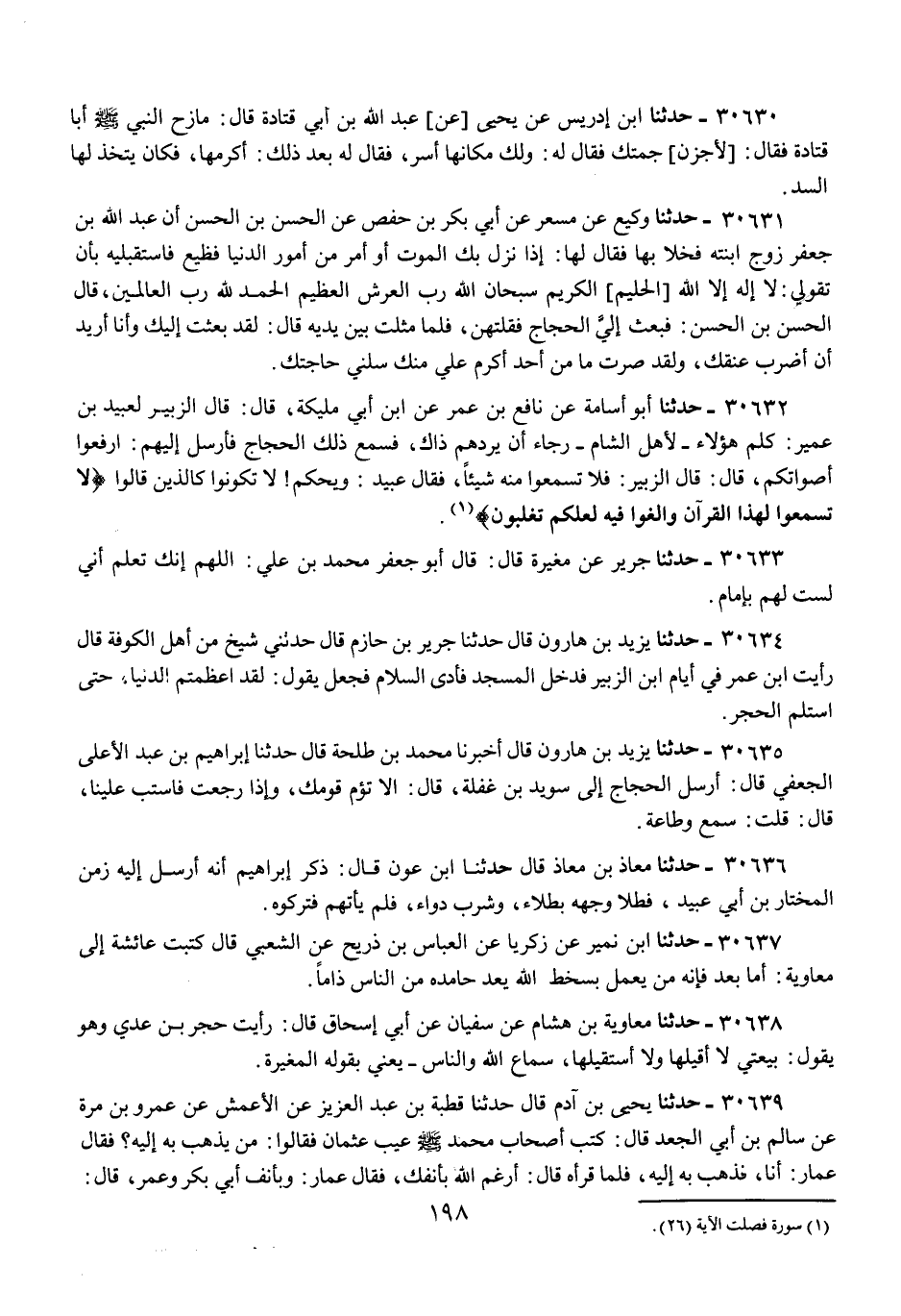 30632 - حَدَّثَنَا أَبُو أُسَامَةَ عَنْ نَافِعٍ عَنِ ابْنِ عُمَرَ عَنِ ابْنِ أَبِي مُلَيْكَةَ قَالَ: قَالَ الزُّبَيْرُ لِعُبَيْدِ بْنِ عُمَيْرٍ: كَلِّمْ هَؤُلَاءِ لِأَهْلِ الشَّامِ رَجَاءَ أَنْ يَرُدَّهُمْ ذَاكَ , فَسَمِعَ ذَلِكَ الْحَجَّاجُ فَأَرْسَلَ إِلَيْهِمُ: ارْفَعُوا أَصْوَاتَكُمْ , قَالَ: قَالَ الزُّبَيْرُ: فَلَا تَسْمَعُوا مِنْهُ شَيْئًا , فَقَالَ عُبَيْدٌ: " وَيْحَكُمْ , لَا تَكُونُوا كَالَّذِينَ قَالُوا: {§لَا تَسْمَعُوا لِهَذَا الْقُرْآنِ وَالْغَوْا فِيهِ لَعَلَّكُمْ تَغْلِبُونَ} [فصلت: 26] "