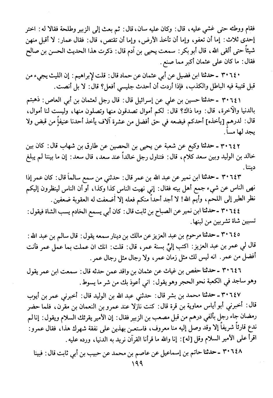 30648 - حَدَّثَنَا حَاتِمُ بْنُ إِسْمَاعِيلَ عَنْ عَاصِمِ بْنِ مُحَمَّدٍ عَنْ حَبِيبِ بْنِ أَبِي ثَابِتٍ قَالَ: فَبَيْنَا -[200]- أَنَا جَالِسٌ فِي الْمَسْجِدِ الْحَرَامِ وَابْنُ عُمَرَ جَالِسٌ فِي نَاحِيَةٍ وَابْنَاهُ عَنْ يَمِينِهِ وَشِمَالِهِ , وَقَدْ خَطَبَ الْحَجَّاجُ بْنُ يُوسُفَ النَّاسَ فَقَالَ: أَلَا إِنَّ ابْنَ الزُّبَيْرِ نَكَّسَ كِتَابَ اللَّهِ , نَكَّسَ اللَّهُ قَلْبَهُ , فَقَالَ ابْنُ عُمَرَ: أَلَا إِنَّ ذَلِكَ لَيْسَ بِيَدِكَ وَلَا بِيَدِهِ , فَسَكَتَ الْحَجَّاجُ هَنِيئَةً إِنْ شِئْتَ قُلْتُ طَوِيلًا وَإِنْ شِئْتَ قُلْتُ لَيْسَ بِطَوِيلٍ ثُمَّ قَالَ: أَلَا إِنَّ اللَّهَ قَدْ عَلَّمَنَا، كُلَّ مُسْلِمٍ وَإِيَّاكَ أَيُّهَا الشَّيْخُ، أَنَّهُ يَفْعَلُ , قَالَ: فَجَعَلَ ابْنُ عُمَرَ يَضْحَكُ فَقَالَ لِمَنْ حَوْلَهُ: " §أَمَّا إِنِّي قَدْ تَرَكْتُ الَّتِي فِيهَا الْفَصْلُ أَنْ أَقُولَ: كَذَبْتَ "