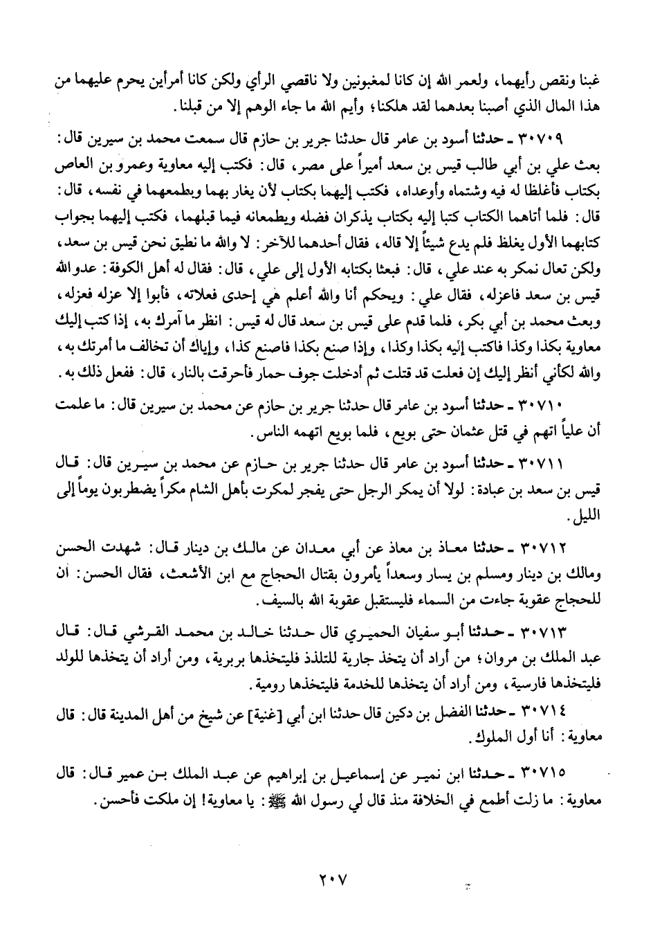 30710 - حَدَّثَنَا أَسْوَدُ بْنُ عَامِرٍ قَالَ: حَدَّثَنَا جَرِيرُ بْنُ حَازِمٍ عَنْ مُحَمَّدِ بْنِ سِيرِينَ قَالَ: «§مَا عَلِمْتُ أَنَّ عَلِيًّا اتُّهِمَ فِي قَتْلِ عُثْمَانَ حَتَّى بُويِعَ , فَلَمَّا بُويِعَ اتَّهَمَهُ النَّاسُ»