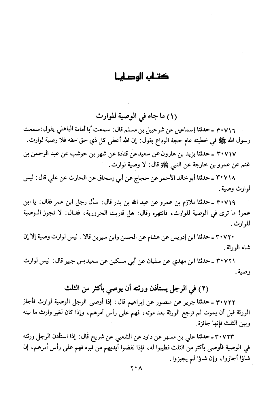 30717 - حَدَّثَنَا يَزِيدُ بْنُ هَارُونَ، عَنْ سَعْدٍ، عَنْ قَتَادَةَ، عَنْ شَهْرِ بْنِ حَوْشَبٍ، عَنْ عَبْدِ الرَّحْمَنِ بْنِ غَنْمٍ، عَنْ عَمْرِو بْنِ خَارِجَةَ، عَنِ النَّبِيِّ صَلَّى اللهُ عَلَيْهِ وَسَلَّمَ قَالَ: «§لَا وَصِيَّةَ لِوَارِثٍ»