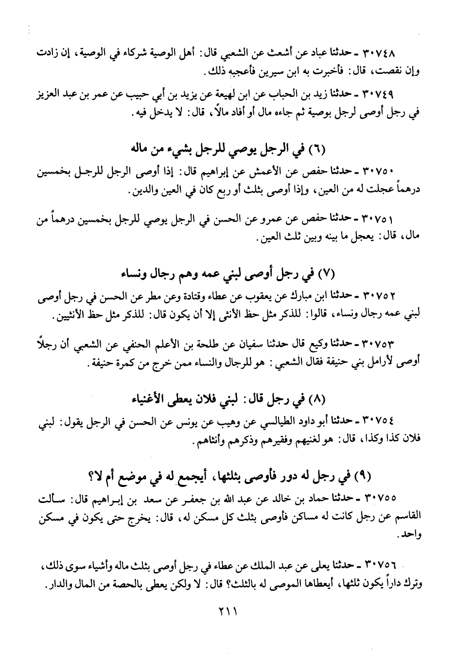 30748 - حَدَّثَنَا عَبَّادٌ، عَنْ أَشْعَثَ، عَنِ الشَّعْبِيِّ قَالَ: «§أَهْلُ الْوَصِيَّةِ شُرَكَاءُ فِي الْوَصِيَّةِ، إِنْ زَادَتْ وَإِنْ نَقَصَتْ» قَالَ: فَأَخْبَرْتُ بِهِ ابْنَ سِيرِينَ فَأَعْجَبَهُ ذَلِكَ