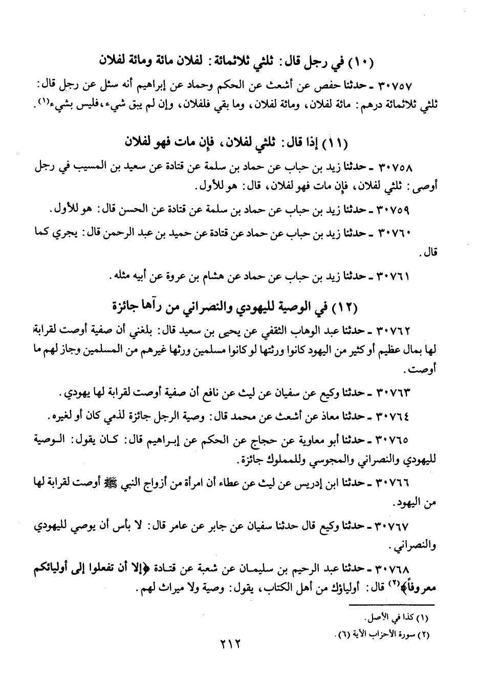 30765 - حَدَّثَنَا أَبُو مُعَاوِيَةَ، عَنْ حَجَّاجٍ، عَنِ الْحَكَمِ، عَنْ إِبْرَاهِيمَ قَالَ: كَانَ يَقُولُ: «§الْوَصِيَّةُ لِلْيَهُودِيِّ وَالنَّصْرَانِيِّ وَالْمَجُوسِيِّ وَلِلْمَمْلُوكِ جَائِزَةً»