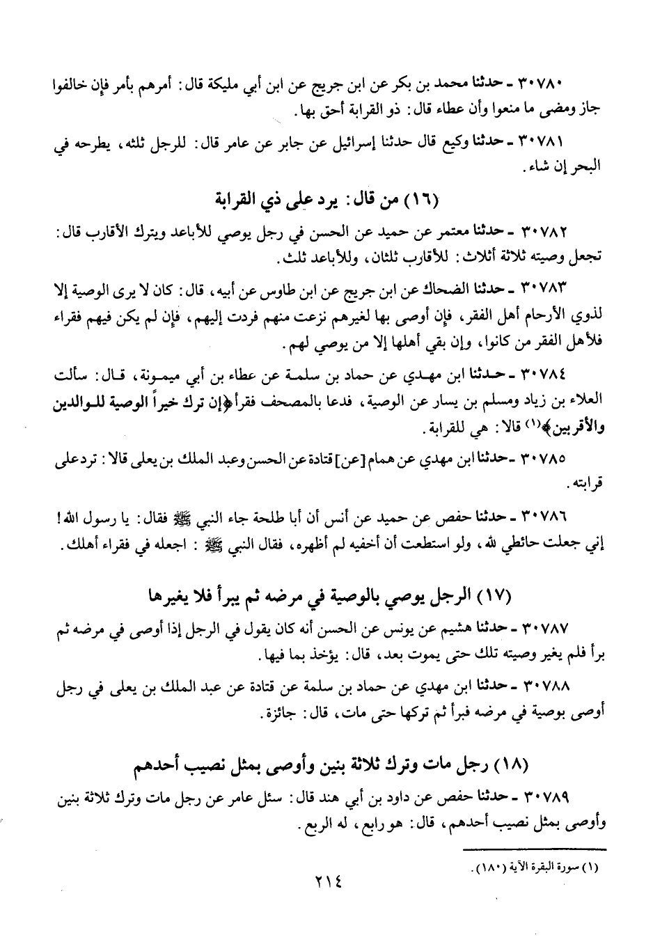 30784 - حَدَّثَنَا ابْنُ مَهْدِيٍّ، عَنْ حَمَّادِ بْنِ سَلَمَةَ، عَنْ عَطَاءِ بْنِ أَبِي مَيْمُونَةَ، قَالَ: سَأَلْتُ الْعَلَاءَ بْنَ زِيَادٍ، وَمُسْلِمَ بْنَ يَسَارٍ عَنِ الْوَصِيَّةِ، فَدَعَا بِالْمُصْحَفِ فَقَرَأَ: {§إِنْ تَرَكَ خَيْرًا الْوَصِيَّةُ لِلْوَالِدَيْنِ وَالْأَقْرَبِينَ} [البقرة: 180] قَالَا: «هِيَ لِلْقَرَابَةِ»