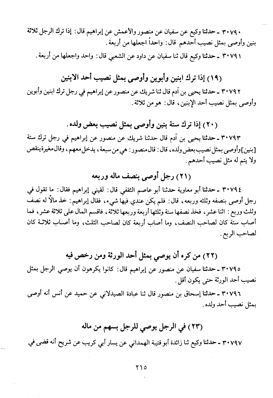 30795 - حَدَّثَنَا سُفْيَانُ، عَنْ مَنْصُورٍ، عَنْ إِبْرَاهِيمَ قَالَ: «كَانُوا §يَكْرَهُونَ أَنْ يُوصِيَ الرَّجُلُ بِمِثْلِ نَصِيبِ أَحَدِ الْوَرَثَةِ حَتَّى يَكُونَ أَقَلَّ»