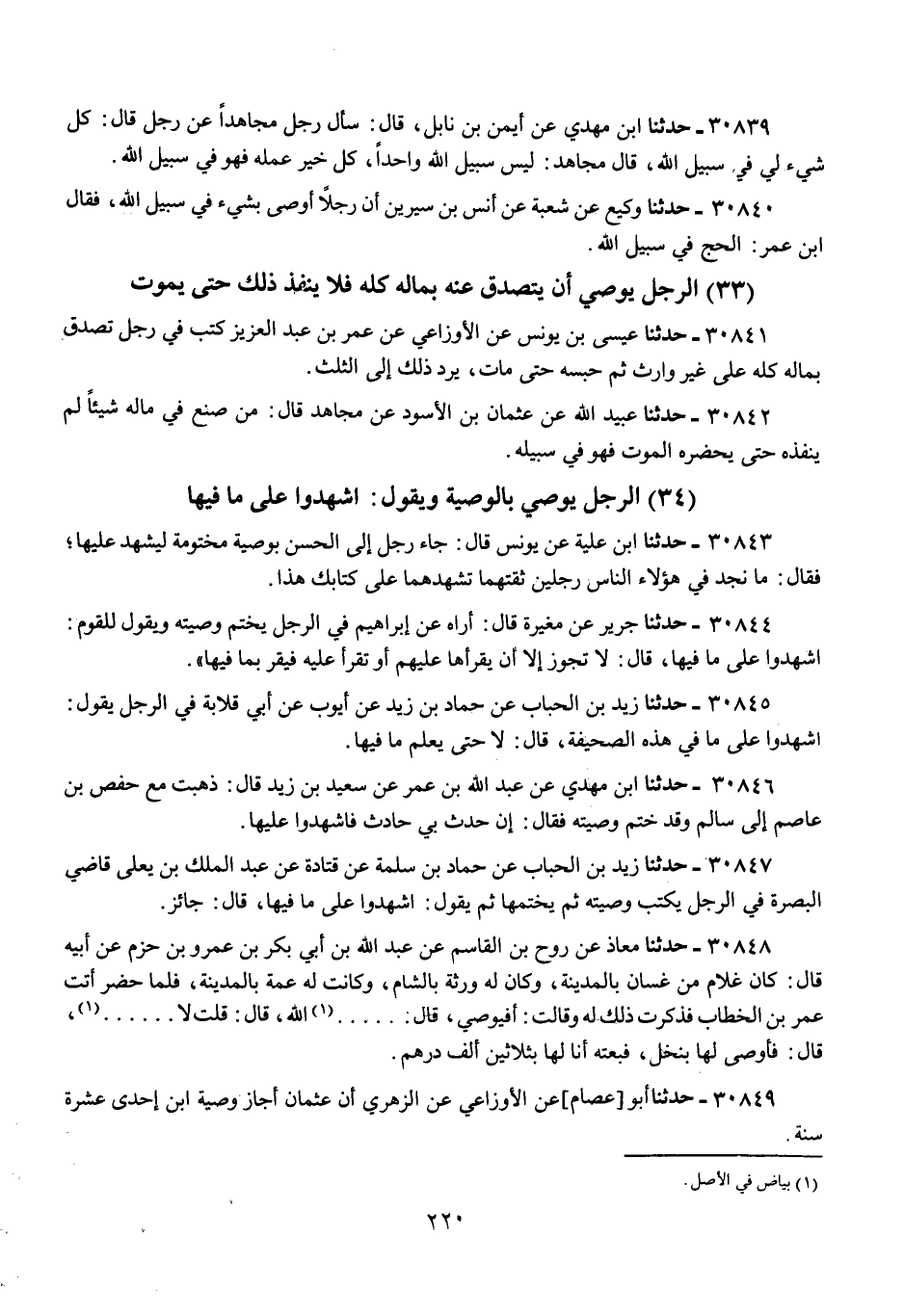 30846 - حَدَّثَنَا ابْنُ مَهْدِيٍّ، عَنْ عَبْدِ اللَّهِ بْنِ عُمَرَ، عَنْ سَعِيدِ بْنِ زَيْدٍ قَالَ: ذَهَبْتُ مَعَ حَفْصِ بْنِ عَاصِمٍ إِلَى سَالِمٍ وَقَدْ خَتَمَ وَصِيَّتَهُ فَقَالَ: «§إِنْ حَدَثَ بِي حَادِثٌ فَاشْهَدُوا عَلَيْهَا»