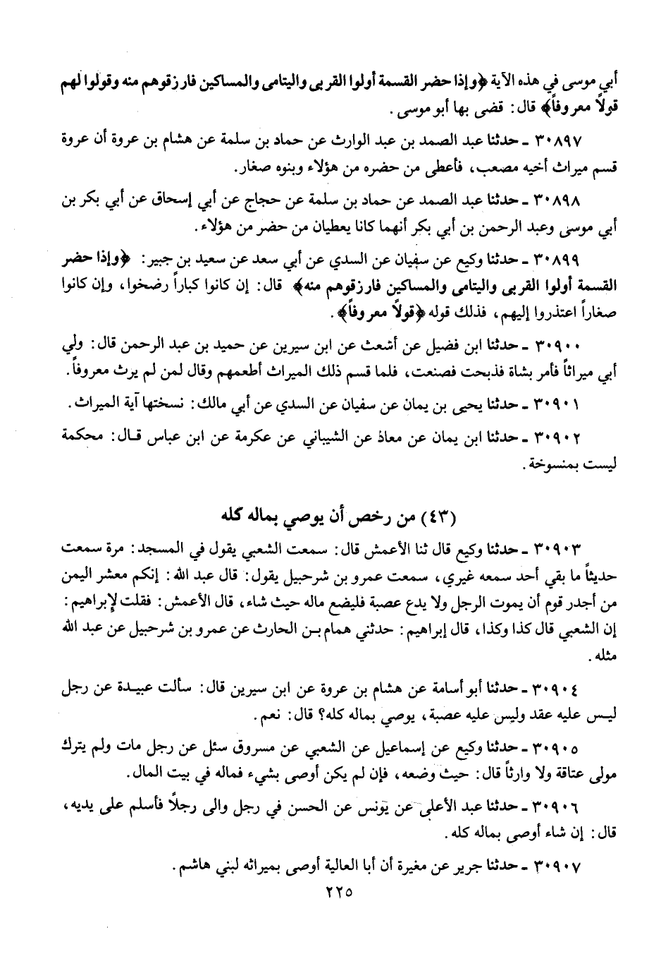 30899 - حَدَّثَنَا وَكِيعٌ، عَنْ سُفْيَانَ، عَنِ السُّدِّيِّ، عَنْ أَبِي سَعْدٍ، عَنْ سَعِيدِ بْنِ جُبَيْرٍ: {§وَإِذَا حَضَرَ الْقِسْمَةَ أُولُو الْقُرْبَى وَالْيَتَامَى وَالْمَسَاكِينُ فَارْزُقُوهُمْ مِنْهُ} قَالَ: «إِنْ كَانُوا كِبَارًا رُضِخُوا، وَإِنْ كَانُوا صِغَارًا اعْتَذَرُوا إِلَيْهِمْ»، فَذَلِكَ قَوْلُهُ: {قَوْلًا مَعْرُوفًا} [البقرة: 235]