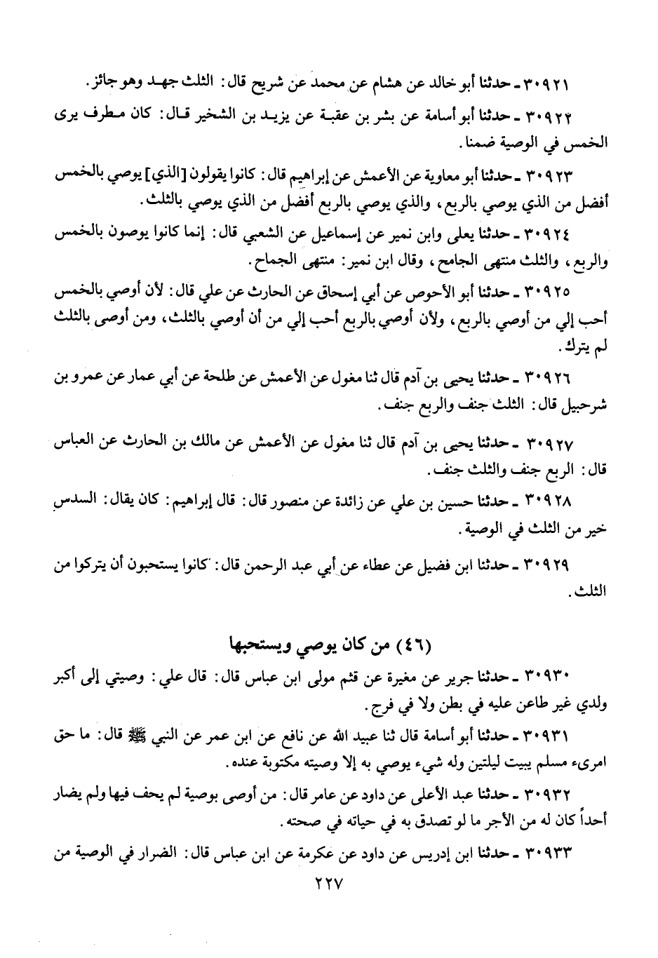 30927 - حَدَّثَنَا يَحْيَى بْنُ آدَمَ قَالَ: ثنا مِغْوَلٌ، عَنِ الْأَعْمَشِ، عَنْ مَالِكِ بْنِ الْحَارِثِ، عَنِ الْعَبَّاسِ قَالَ: «§الرُّبُعُ جَنَفٌ، وَالثُّلُثُ جَنَفٌ»