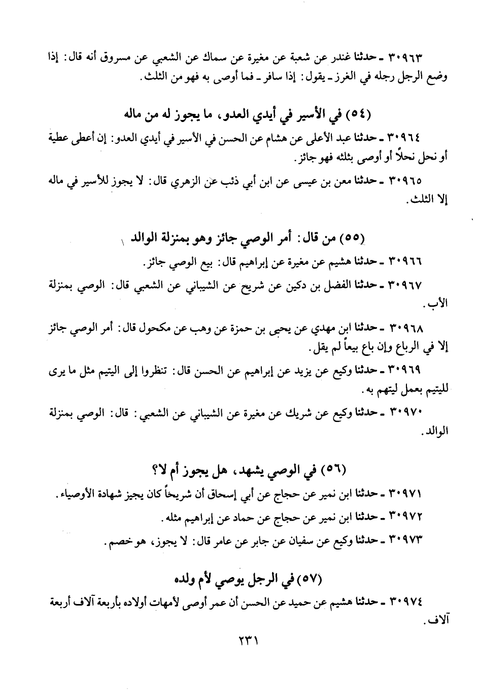 30967 - حَدَّثَنَا الْفَضْلُ بْنُ دُكَيْنٍ، عَنْ شُرَيْحٍ، عَنِ الشَّيْبَانِيِّ، عَنِ الشَّعْبِيِّ قَالَ: «§الْوَصِيُّ بِمَنْزِلَةِ الْأَبِ»