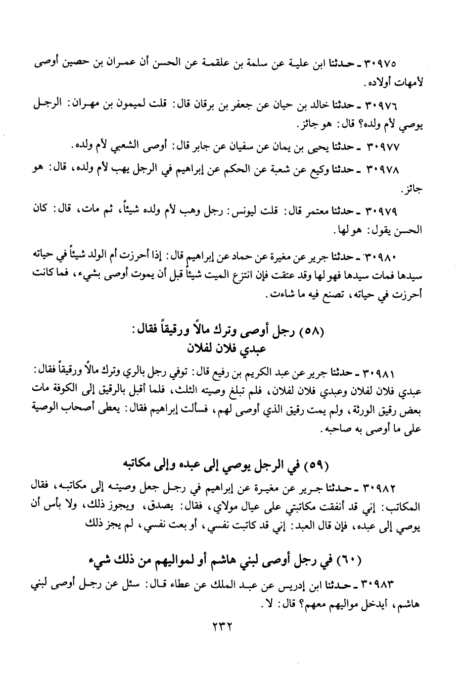 30981 - حَدَّثَنَا جَرِيرٌ، عَنْ عَبْدِ الْعَزِيزِ بْنِ رُفَيْعٍ، قَالَ: تُوُفِّيَ رَجُلٌ بِالرَّيِّ وَتَرَكَ مَالًا وَرَقِيقًا فَقَالَ: عَبْدِي فُلَانٌ لِفُلَانٍ وَعَبْدِي فُلَانٌ لِفُلَانٍ، فَلَمْ تَبْلُغْ وَصِيَّتُهُ الثُّلُثَ، فَلَمَّا أَقْبَلَ بِالرَّقِيقِ إِلَى الْكُوفَةِ مَاتَ بَعْضُ رَقِيقِ الْوَرَثَةِ، وَلَمْ يَمُتْ رَقِيقُ الَّذِي أَوْصَى لَهُمْ، فَسَأَلْتُ إِبْرَاهِيمَ فَقَالَ: «§يُعْطِي أَصْحَابَ الْوَصِيَّةِ عَلَى مَا أَوْصَى بِهِ صَاحِبُهُ»