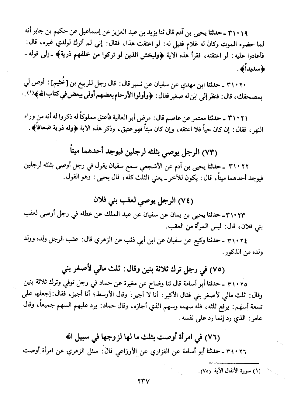 31019 - حَدَّثَنَا يَحْيَى بْنُ آدَمَ قَالَ: ثنا يَزِيدُ بْنُ عَبْدِ الْعَزِيزِ، عَنْ إِسْمَاعِيلَ، عَنْ حَكِيمِ بْنِ جَابِرٍ، أَنَّهُ لَمَّا حَضَرَهُ الْمَوْتُ وَكَانَ لَهُ غُلَامٌ فَقِيلَ لَهُ: لَوْ أَعْتَقْتَ هَذَا، فَقَالَ: «إِنِّي لَمْ أَتْرُكْ لِوَلَدِي غَيْرَهُ»، قَالَ: فَأَعَادُوا عَلَيْهِ: لَوْ أَعْتَقَهُ، «فَقَرَأَ هَذِهِ الْآيَةَ» {§وَلْيَخْشَ الَّذِينَ لَوْ تَرَكُوا مِنْ خَلْفِهِمْ ذُرِّيَّةً} [النساء: 9] إِلَى قَوْلِهِ: {سَدِيدًا} [النساء: 9]