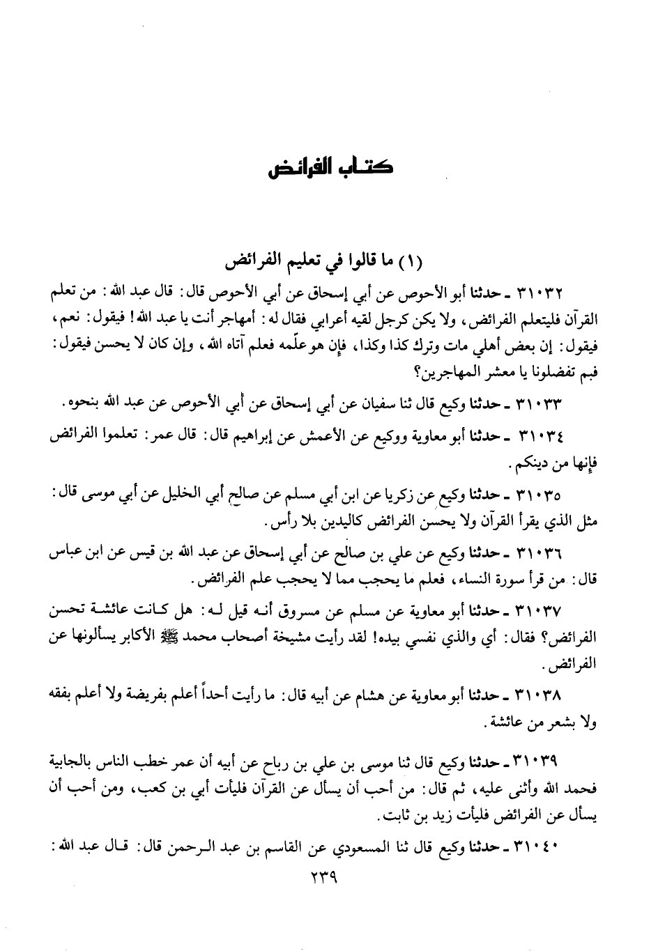 31040 - حَدَّثَنَا وَكِيعٌ قَالَ: ثنا الْمَسْعُودِيُّ، عَنِ الْقَاسِمِ بْنِ عَبْدِ الرَّحْمَنِ قَالَ: قَالَ عَبْدُ اللَّهِ: «§تَعَلَّمُوا الْقُرْآنَ وَالْفَرَائِضَ، فَإِنَّهُ يُوشِكُ أَنْ يَفْتَقِرَ الرَّجُلُ إِلَى عِلْمٍ كَانَ يَعْلَمُهُ، أَوْ يَبْقَى فِي قَوْمٍ لَا يَعْلَمُونَ»